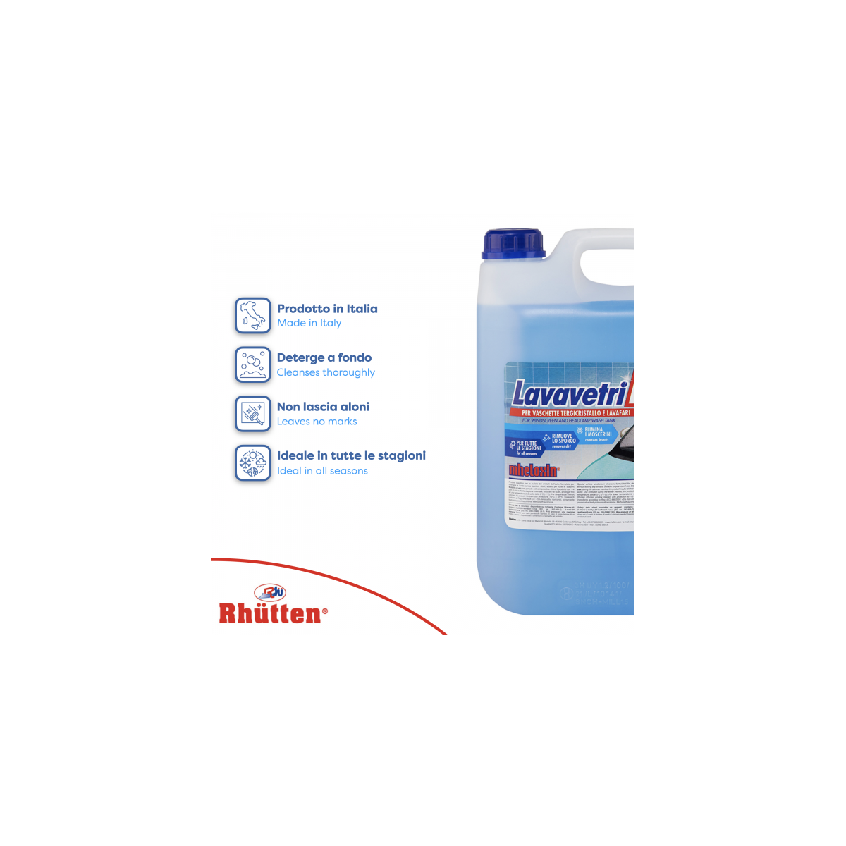 Modalità d’uso: nel periodo estivo è possibile diluire il prodotto con 1-4 parti di acqua. Nella stagione invernale, utilizzato tal quale, protegge fino ad una temperatura al di sotto dello 0°C (-1°C). Per temperature inferiori, utilizzare il Lavavetri Rhütten con protezione -10°C e -20°C.