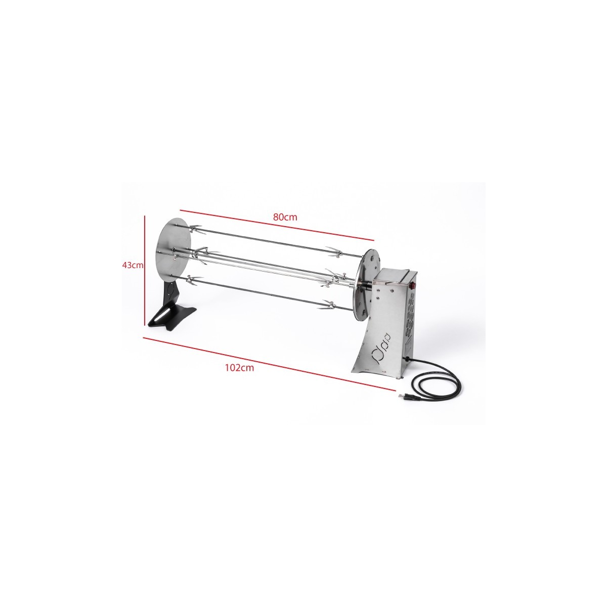 Girarrosto Elettrico a 4 spiedi giranti su se stessi,disco laterale, spiedo centrale portante di sezione quadra 8 mm, spiedi perimetrali di sezione quadra 5 mm, n. 10 forchette, materiali di costruzione inAcciaio Inox, motoriduttore portata 40 kg, g/min 2, con sistema forzato di raffreddamento.