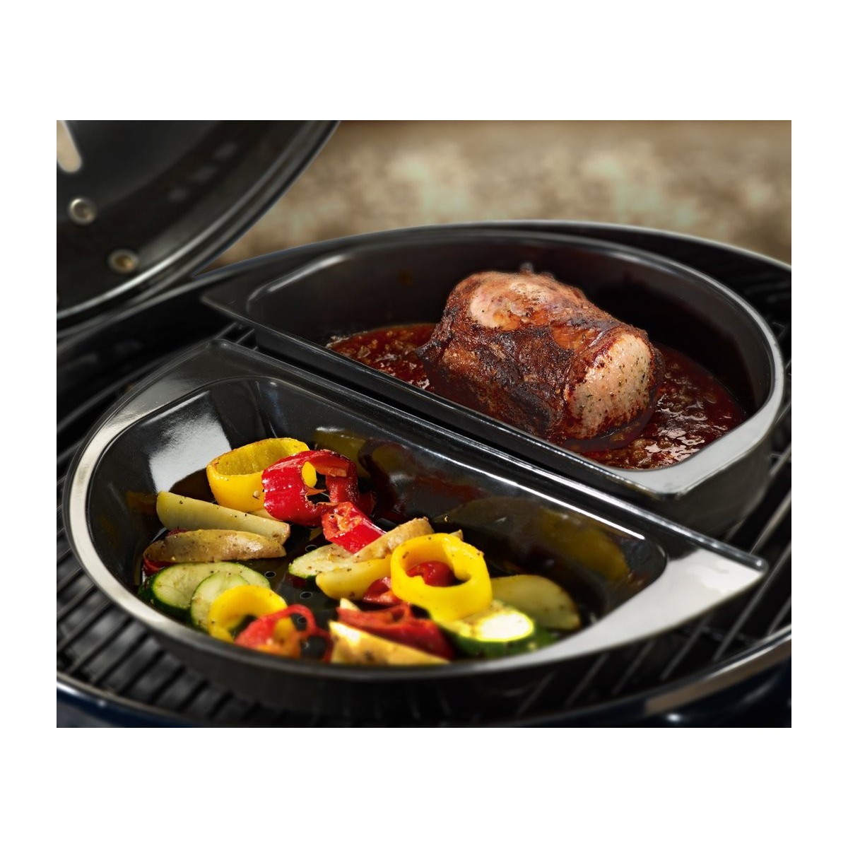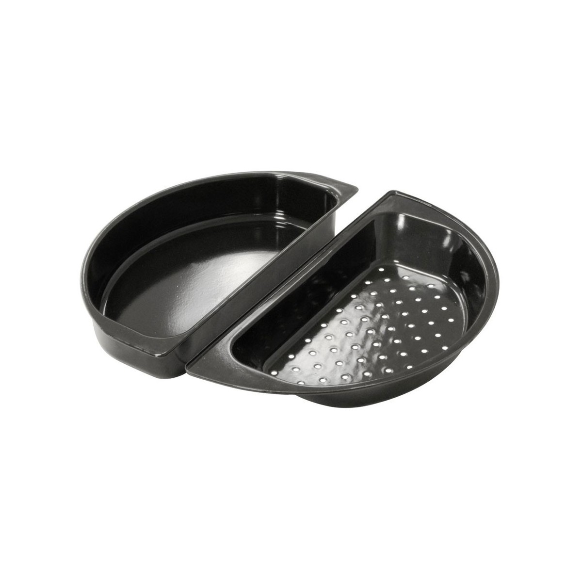I due vassoietti per gourmet a mezzaluna, con smalto in porcellana, possono essere utilizzati singolarmente o in combinazione. Mentre l’arrosto cuoce in umido in uno dei vassoietti, le verdure si scaldano a fuoco lento nell’altro.