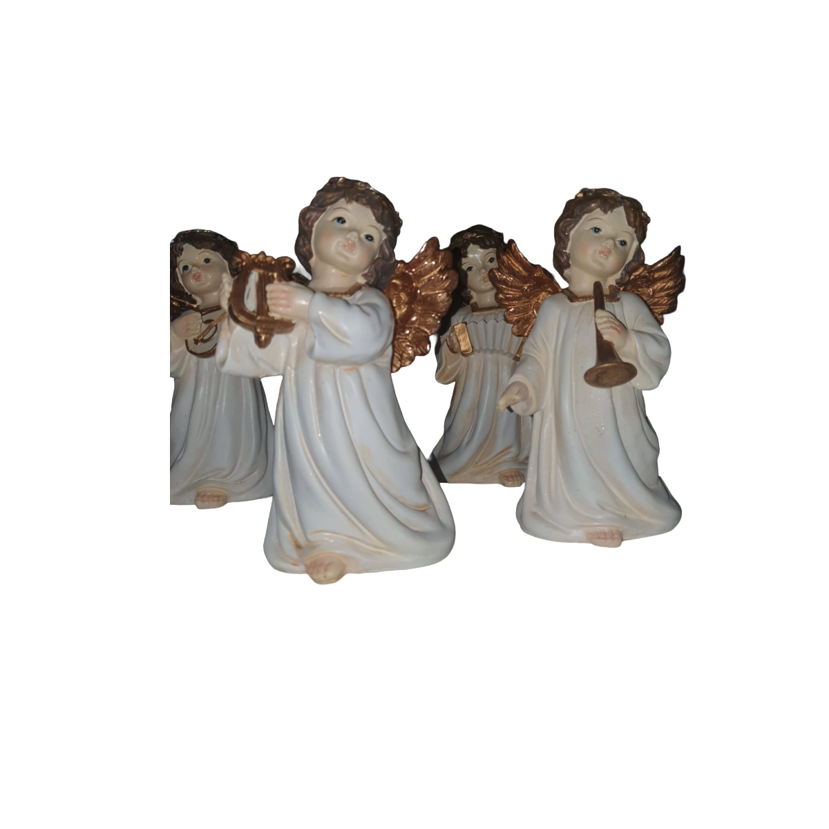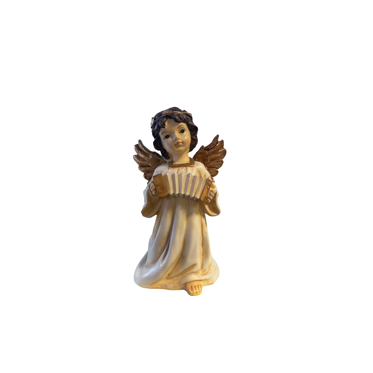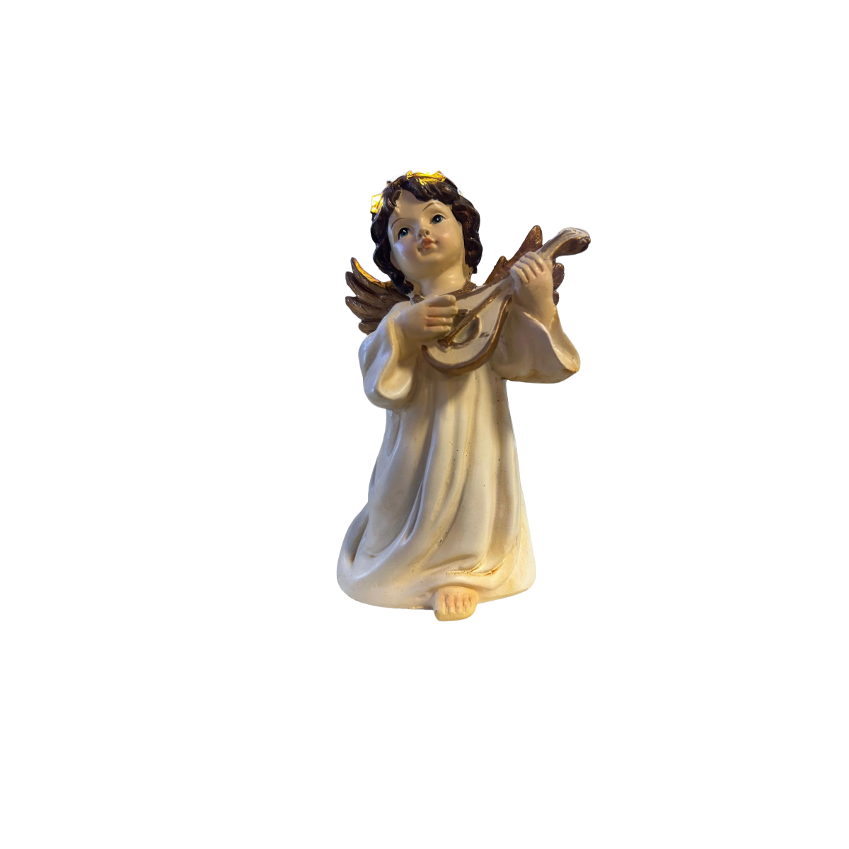 Raffinata statuina natalizia raffigurante un dolce angelo con ali dorate e veste avorio, realizzata con cura nei dettagli. L’angelo tiene in mano uno strumento musicale, creando una scena elegante e armoniosa, perfetta per arricchire presepi, decorazioni natalizie o ambienti d’atmosfera.