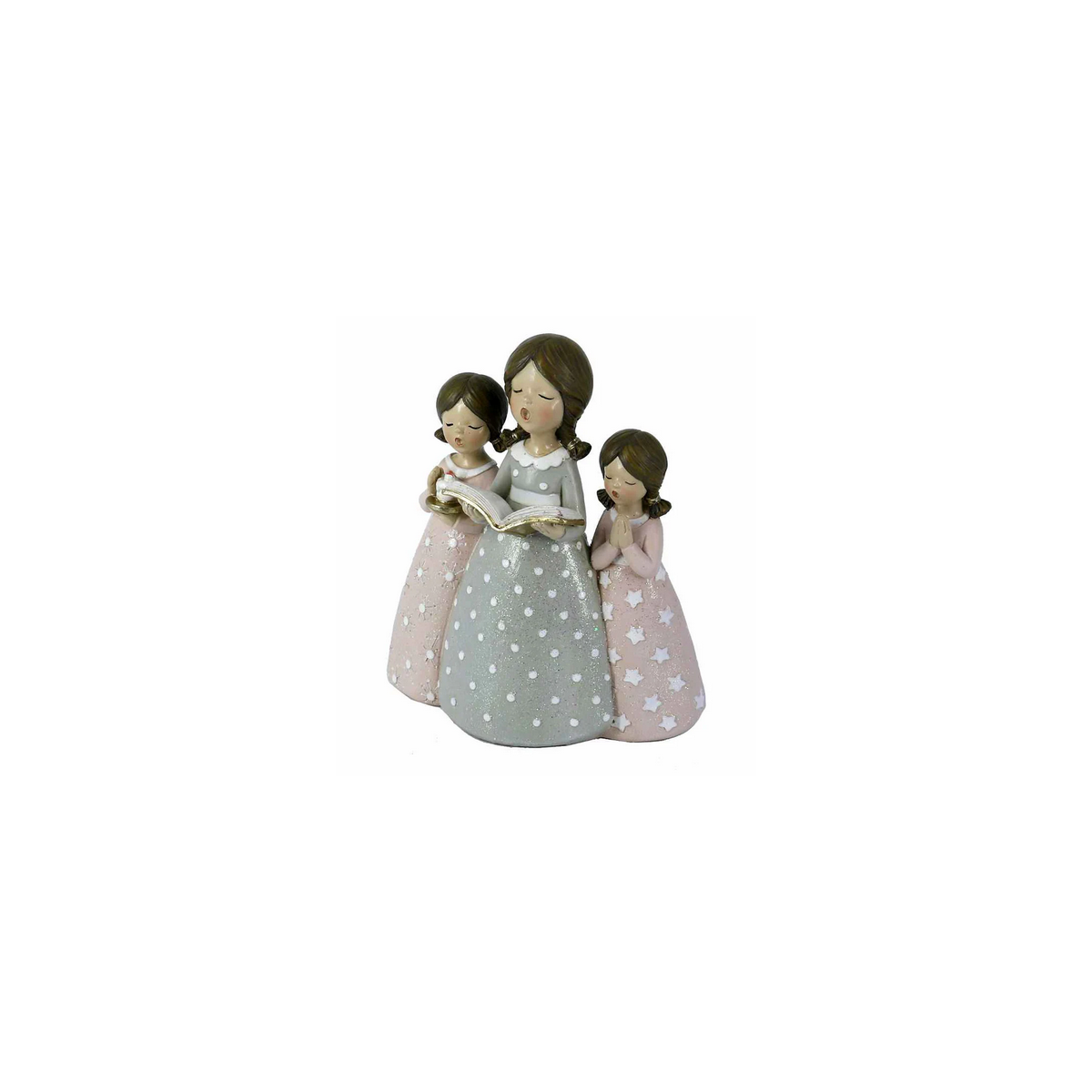 Deliziosa statuina in resina raffigurante tre dolci bambine che cantano insieme, una scena tenera e raffinata perfetta per decorare la casa durante il periodo natalizio. Le bambine indossano abiti pastello decorati con pois e stelline in rilievo, con dettagli glitterati che donano un tocco di luce ed eleganza.