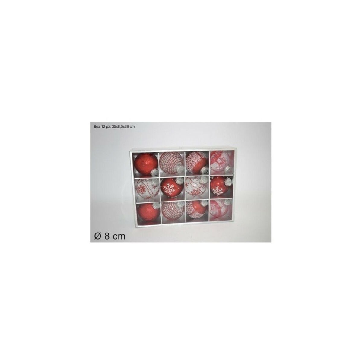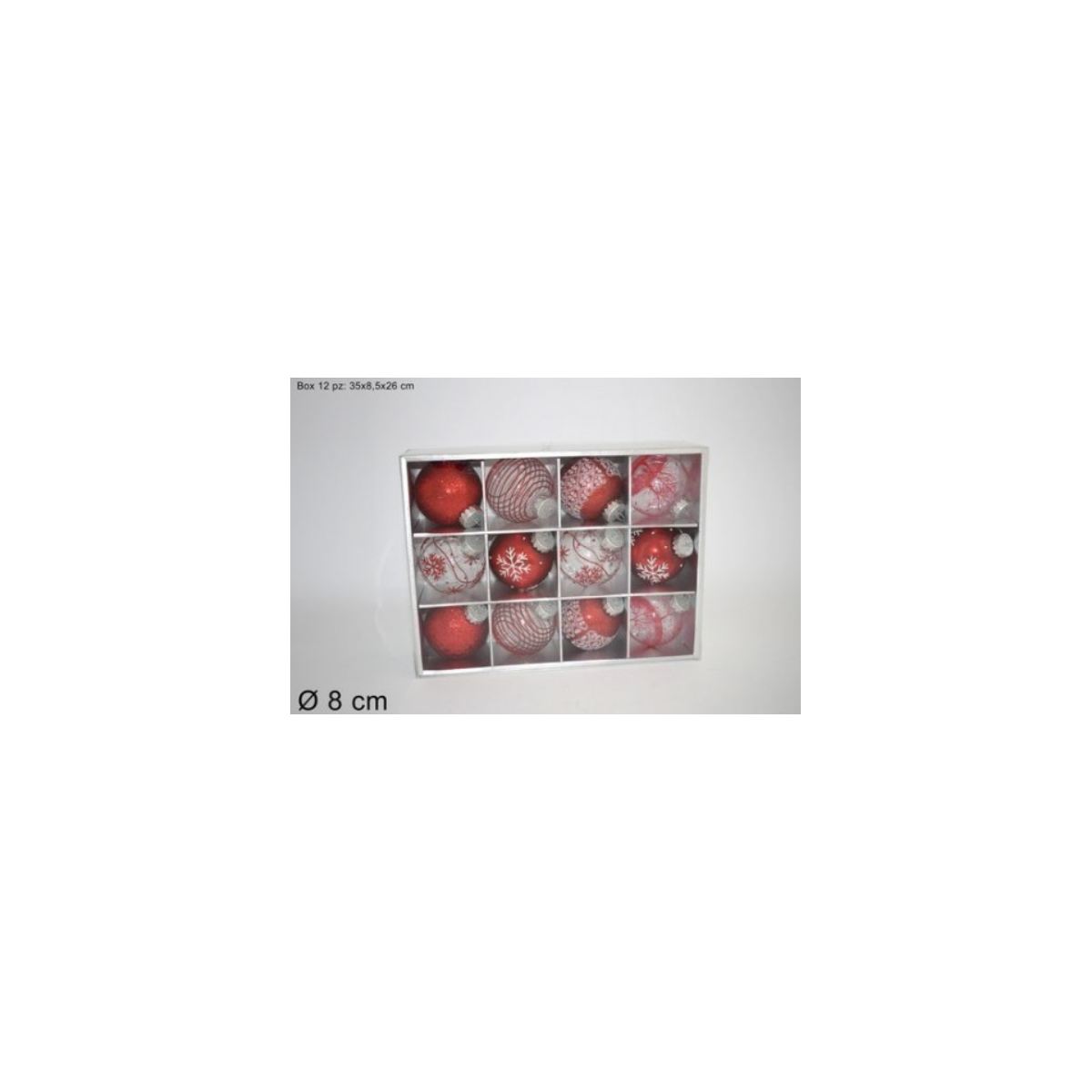 Box composta da 12 palline rosse con inserti bianchi, diametro 8 cm.