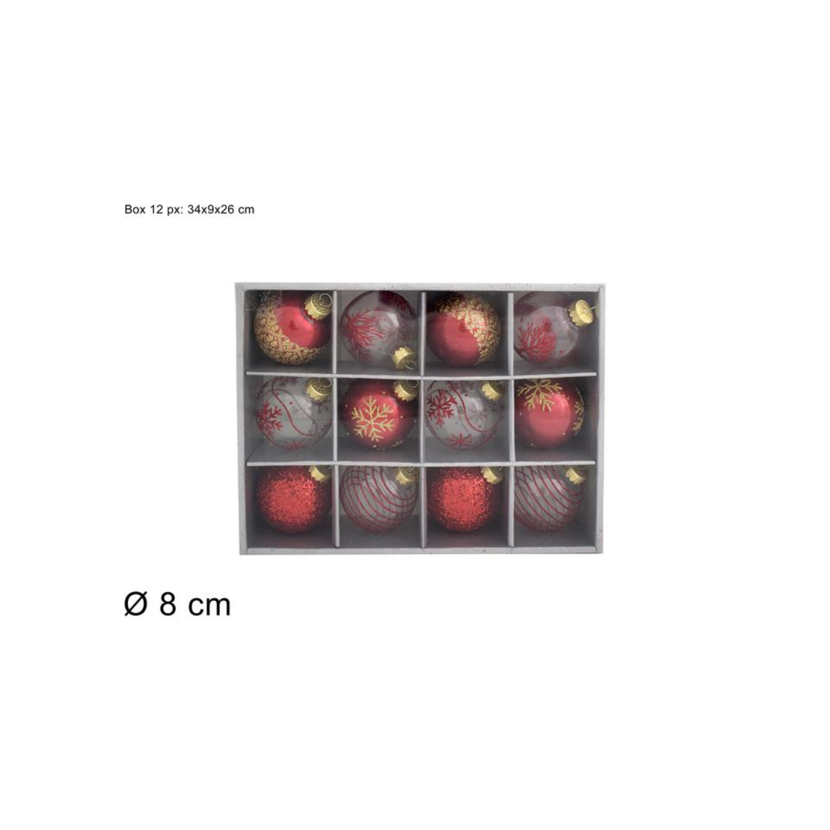 Box composta da 12 palline rosse con inserti dorati, diametro 8 cm.