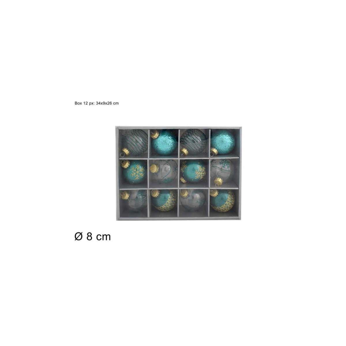 Box composta da 12 palline verdi con inserti dorati, diametro 8 cm.