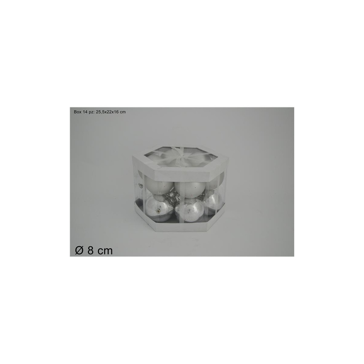 Box composta da 14 palline natalizie, diametro 8 cm. Colore argento