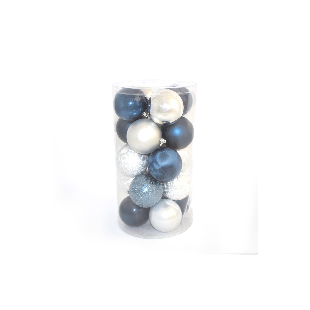 Box composta da 20 palline natalizie in plastica diametro 8 cm. Colore blu e argento.