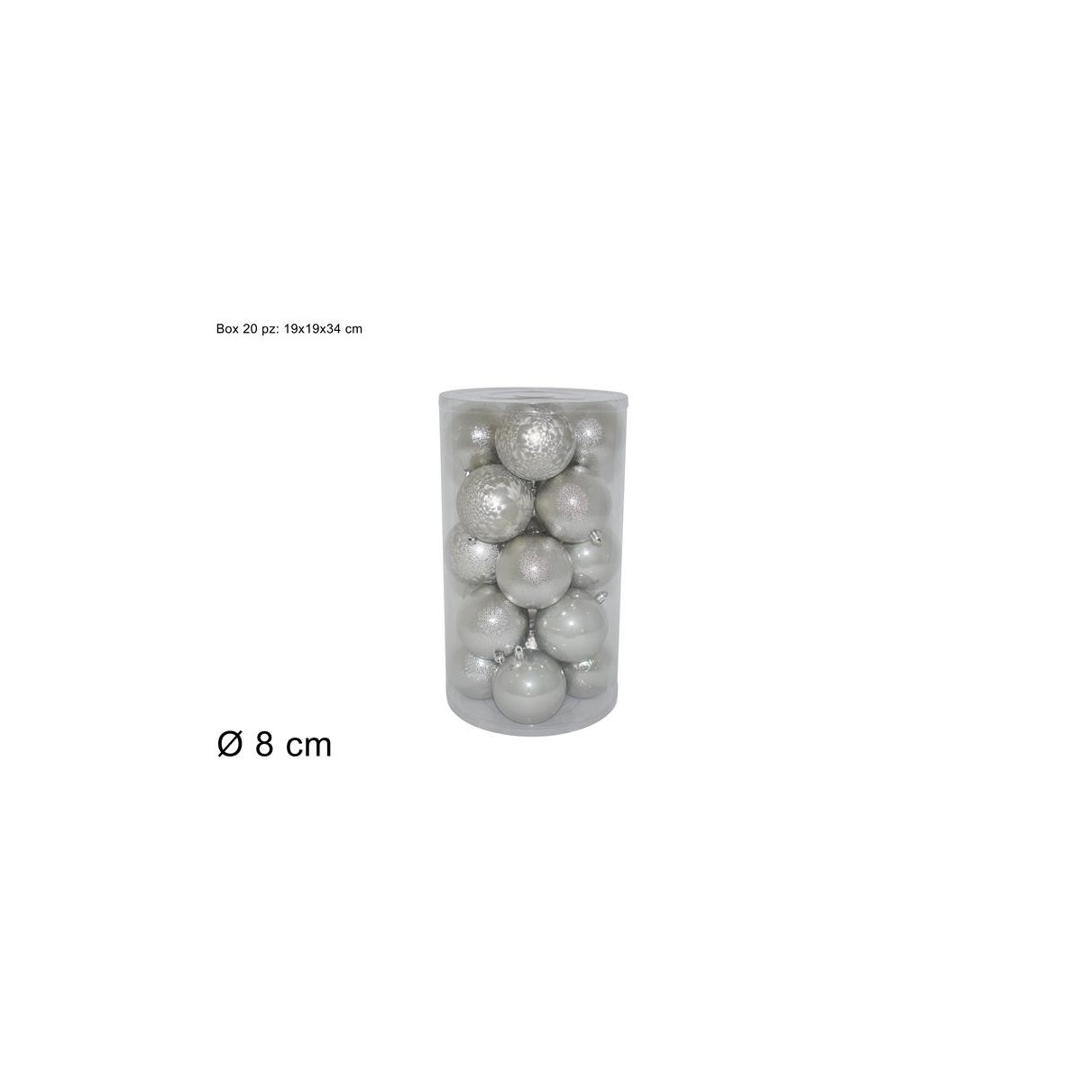 Box composta da 20 palline natalizie in plastica diametro 8 cm. Colore argento lucido.