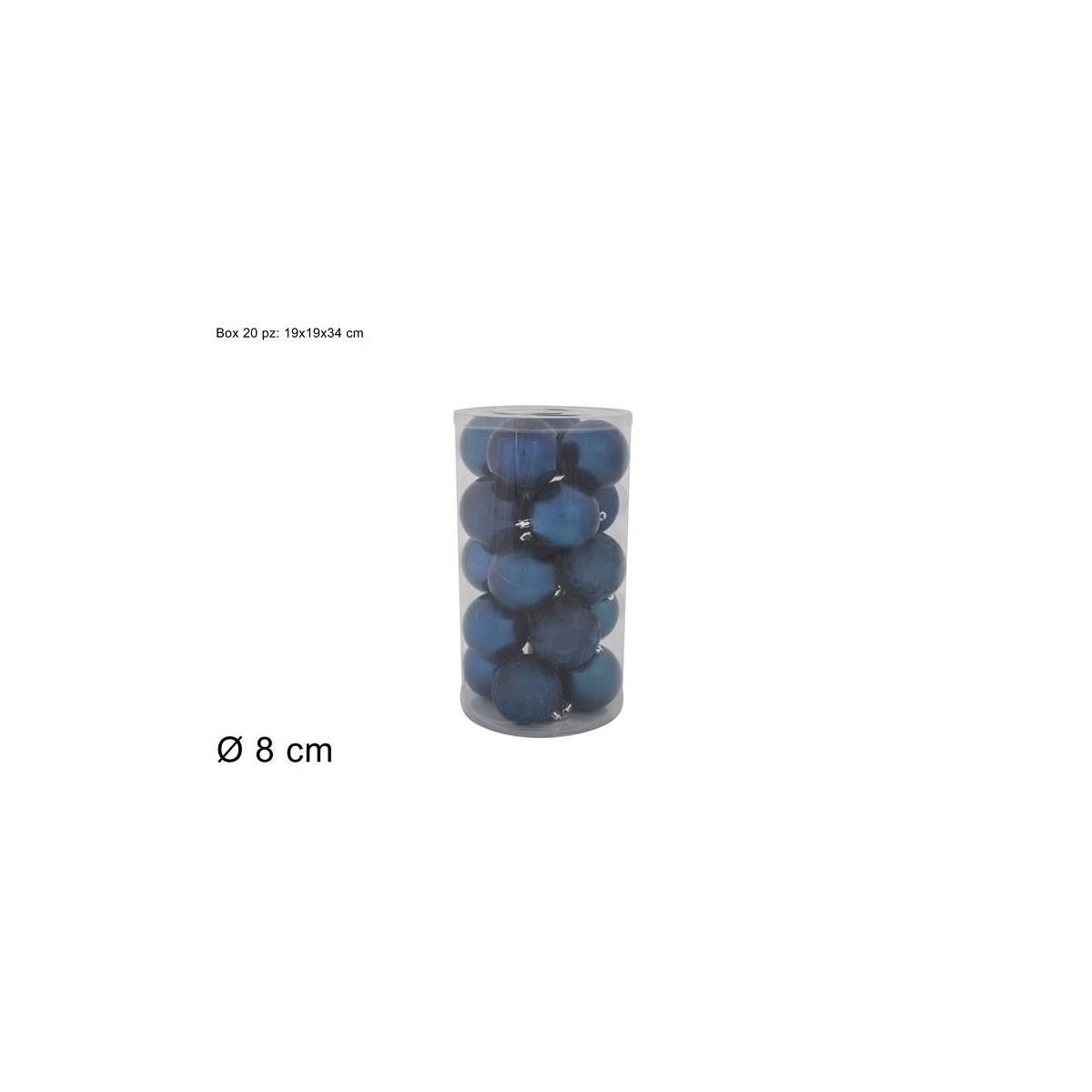 Box composta da 20 palline natalizie in plastica diametro 8 cm. Colore blu lucido.