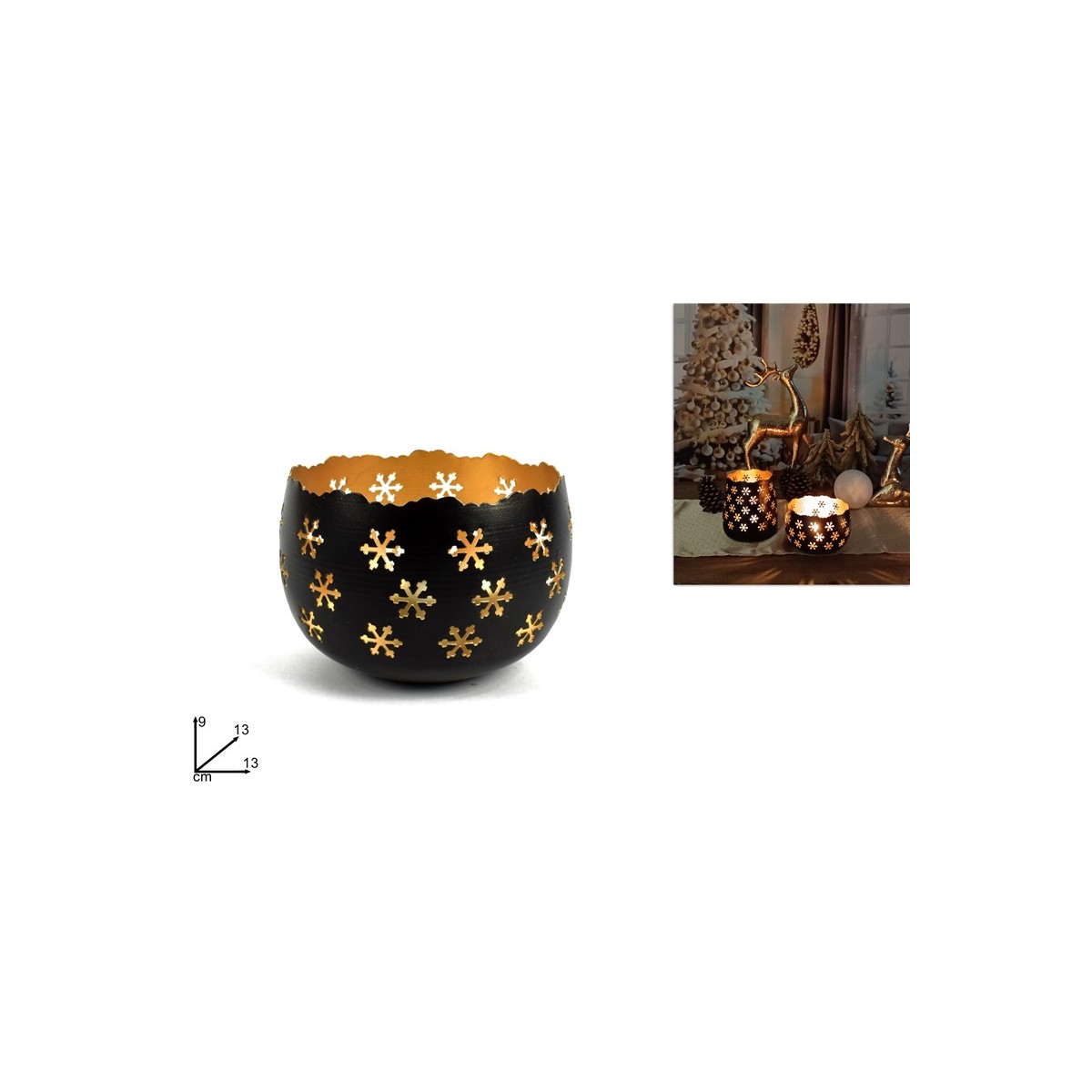 Crea un’atmosfera calda e incantata con questo raffinato portacandela natalizio in metallo, decorato con eleganti intagli a forma di fiocchi di neve. L’esterno nero opaco si contrappone all’interno color oro, che riflette la luce della candela creando giochi luminosi suggestivi e accoglienti.