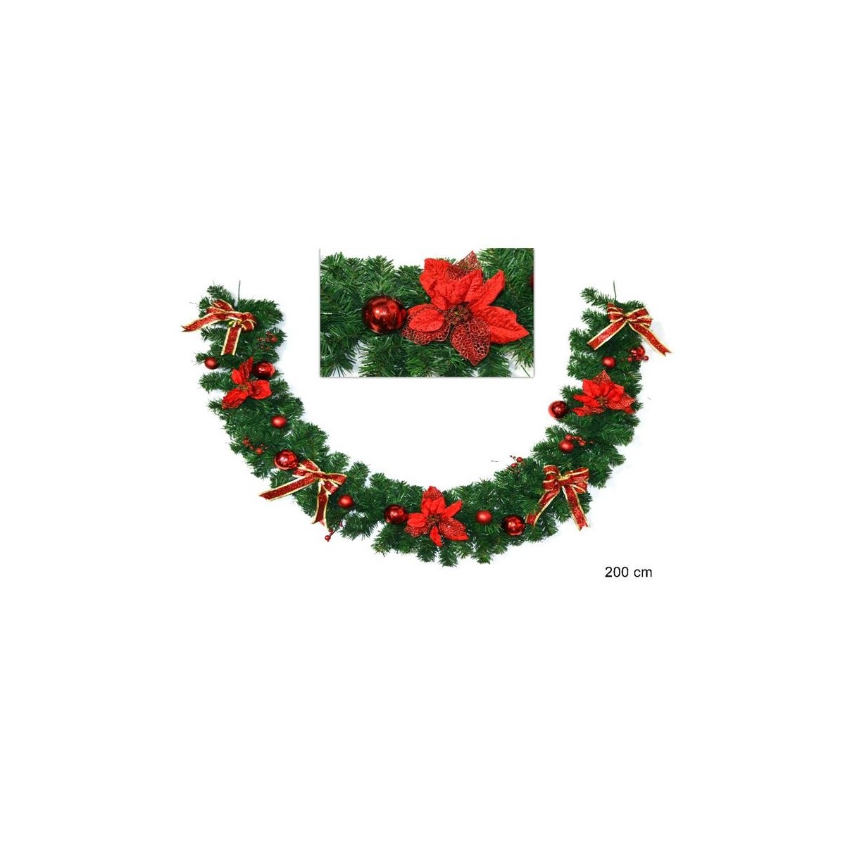 Ghirlanda natalizia folta ed addobbata. Ricca di fiocchetti e palline rosse. Misura 200 cm.