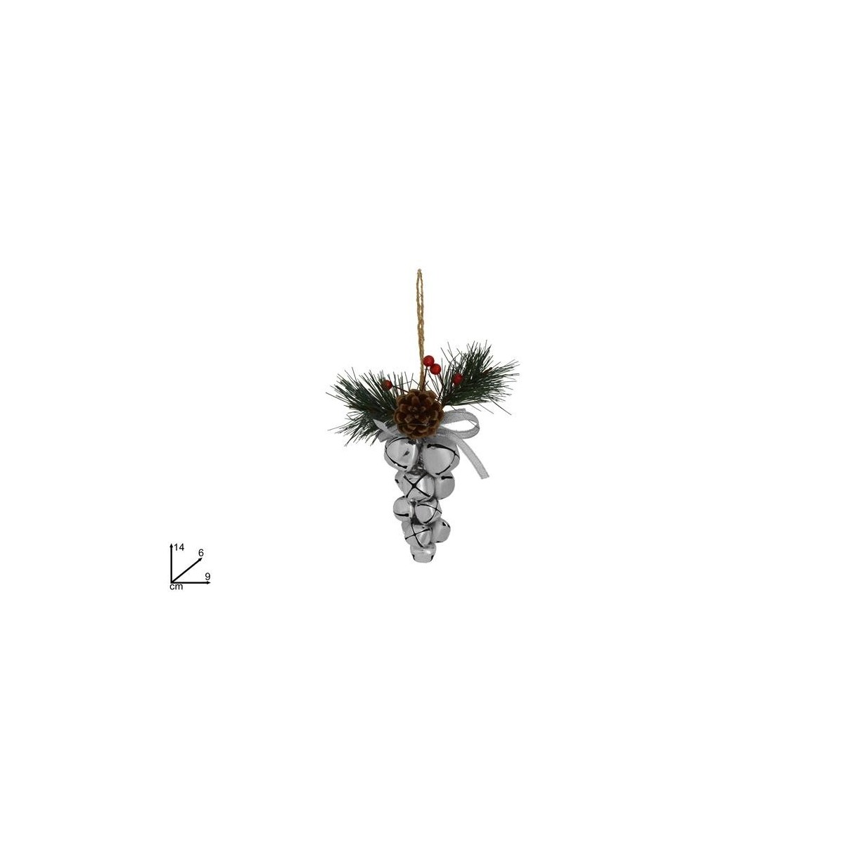 Grappolo di campanelli colore argento da appendere al vostro albero di Natale. Con ramo di pino e pigna.