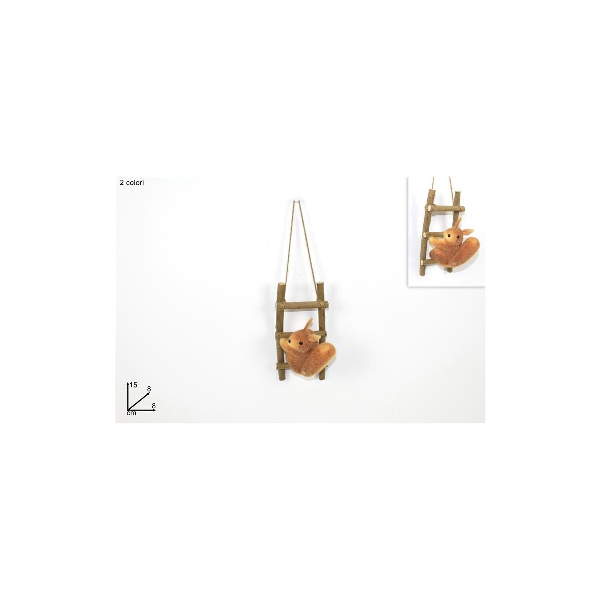Scoiattolo su scaletta in legno, da appendere. Misura: 15 cm.
