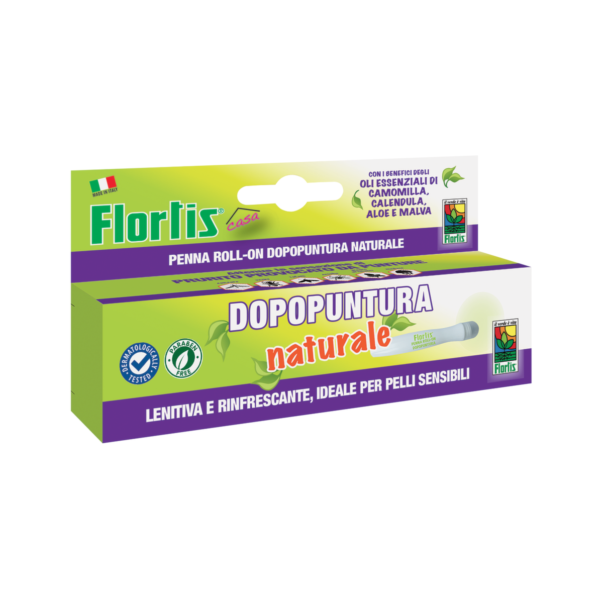 Penna Roll-on dopopuntura naturale, lenitiva ed emolliente, allieva la sensazione di prurito in caso di punture di zanzare, mosche, vespe, tafani, zecche e insetti in genere, o in caso di contatto con piante urticanti o meduse. I suoi componenti naturali (aloe, camomilla, malva, calendula) e la glicerina, favoriscono l’azione decongestionante e rinfrescante, prolungando la sensazione di sollievo. Non unge e lascia la pelle delicatamente profumata. Senza ammoniaca, alcol, parabeni, allergeni, solventi e coloranti, è adatto anche alle pelli più sensibili.