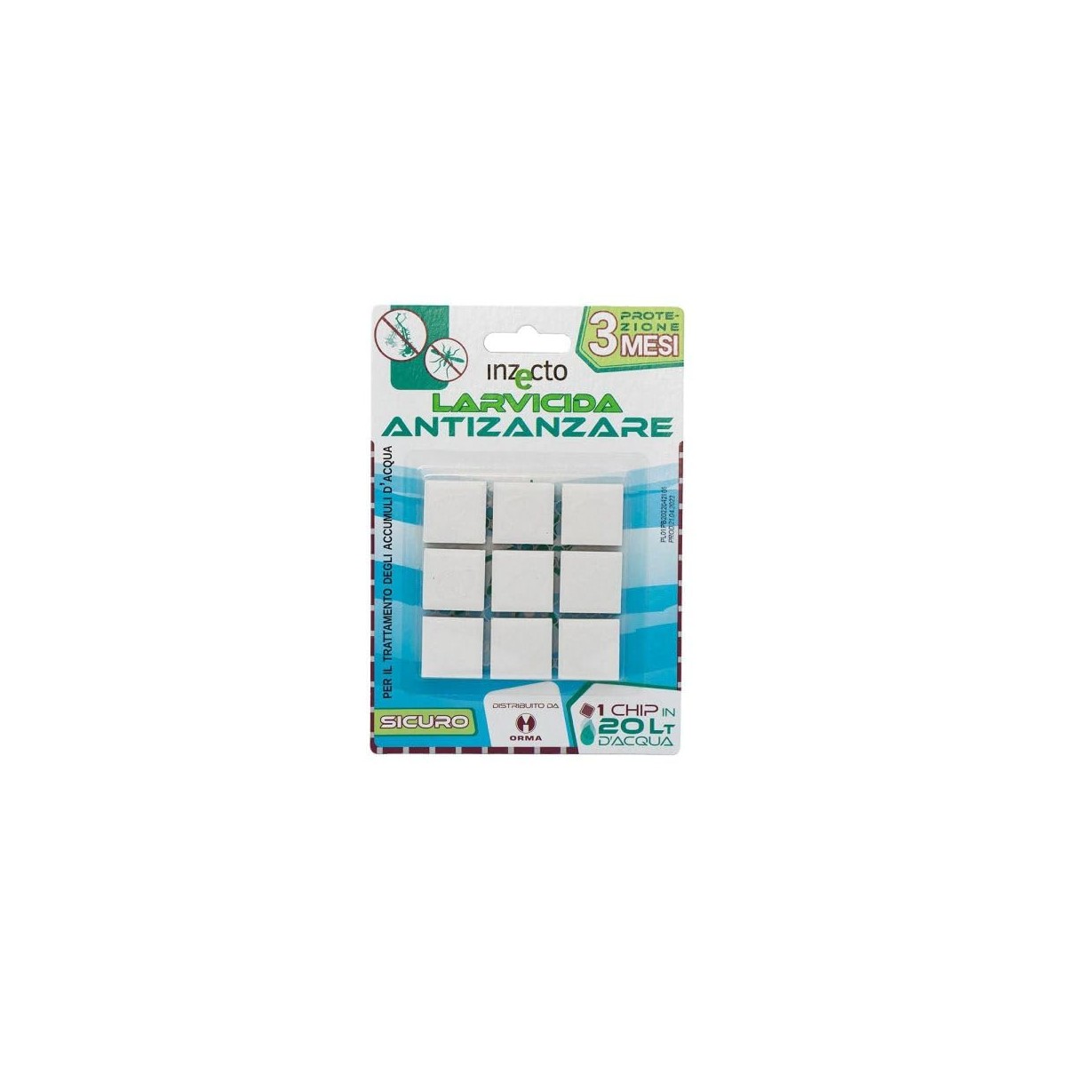 Mosquito Chips è un Innovativo prodotto posizionabile in qualsiasi deposito temporaneo o permanente di acqua naturale o artificiale, utile per prevenire o controllare ventuali infestazioni. Mosquito Chips è composto da un supporto a lento rilascio ed un principio attivo efficace contro le larve di zanzara: il PIRIPROXIFEN. Il Piriproxifen, rilasciato dalla chip, è un inibitore della crescita attivo già a bassissime dosi per contatto o ingestione che interrompe il normale ciclo di sviluppo delle forme giovanili di zanzara. Una sola chip è in grado di inibire lo sviluppo di larve di zanzare per tre mesi, consentendo così di ridurre il numero di trattamenti necessari, mantenendo un’elevata efficacia. Il supporto di Mosquito Chips ha un alto peso specifico che fa precipitare il prodotto sul fondo dell’accumulo d’acqua, evitando così eventuali dilavamenti accidentali. La chip, dopo essersi posizionata, rilascia lentamente e per tre mesi una piccolissima dose di principio attivo, in grado di proteggere un volume d’acqua fino a 20 litri. Sicuro per le persone e gli animali ed in genere per tutti i vertebrati, Mosquito chips può essere utilizzato sia dal professionista, sia all’occorrenza dal non professionista in piena sicurezza. UTILIZZO: Posizionabile in vasi e sottovasi, piccoli o grandi accumuli d’acqua, Mosquito Chips interrompe il ciclo riproduttivo delle zanzare, impedendo a seconda dello stadio di sviluppo considerato: la schiusa delle uova; l’impupamento delle larve; lo sfarfallamento degli adulti.