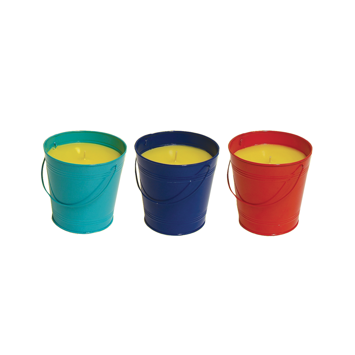 Secchiello in metallo colorato con candela alla citronella. Dimensioni cm 12x12