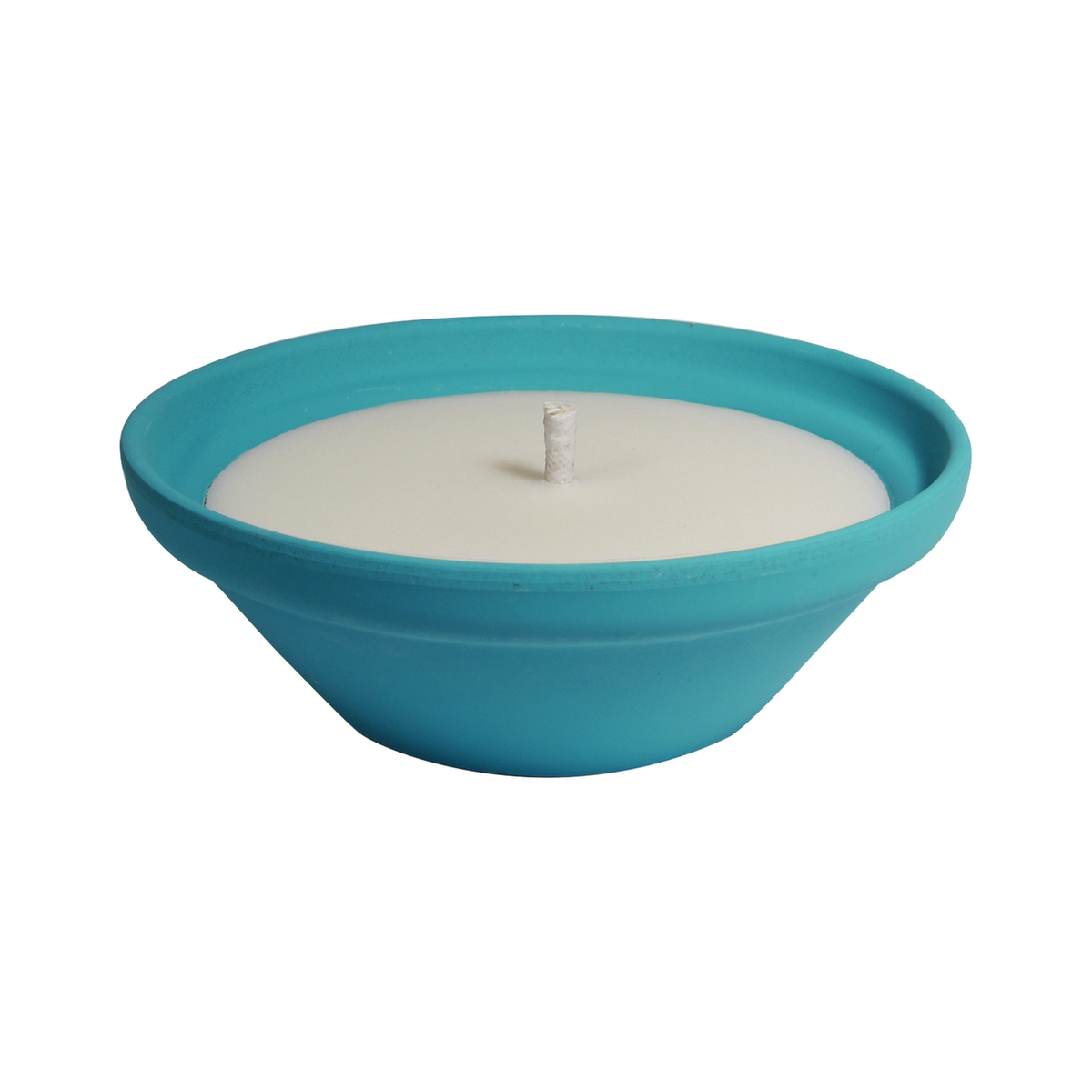 Vaso in terracotta colorata con candela alla citronella. Dimensioni cm 15,5x7.