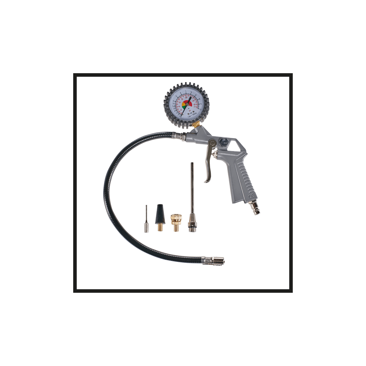 - Incl. pistola di soffiaggio, manometro per pneumatici e set di adattatori da 3 pezzi.