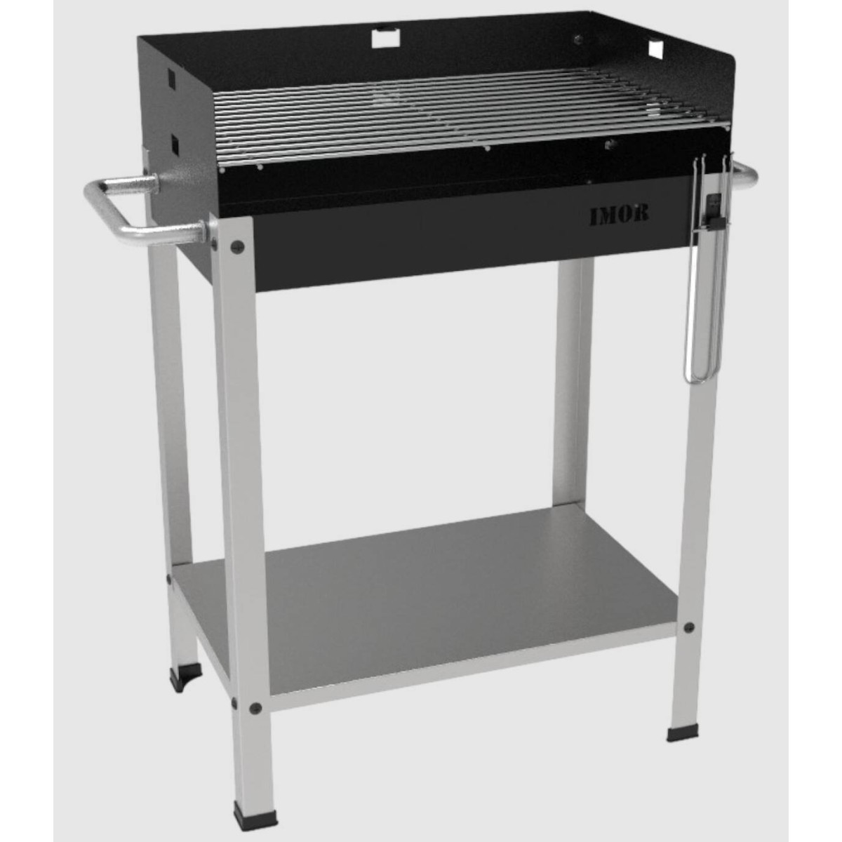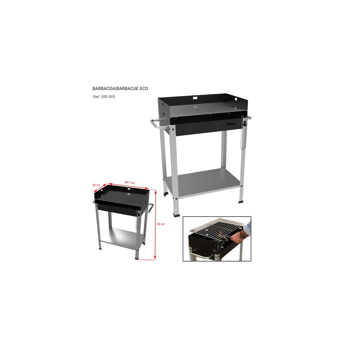 Questo barbecue è dotato di manici, con bruciatore a carbone, ha una griglia e vasca in acciaio inox, vassoio inferiore per accessori e quattro gambe con cuscinetti in gomma. La griglia può essere utilizzata in due altezze, include due maniglie rimovibili con supporto su un lato.