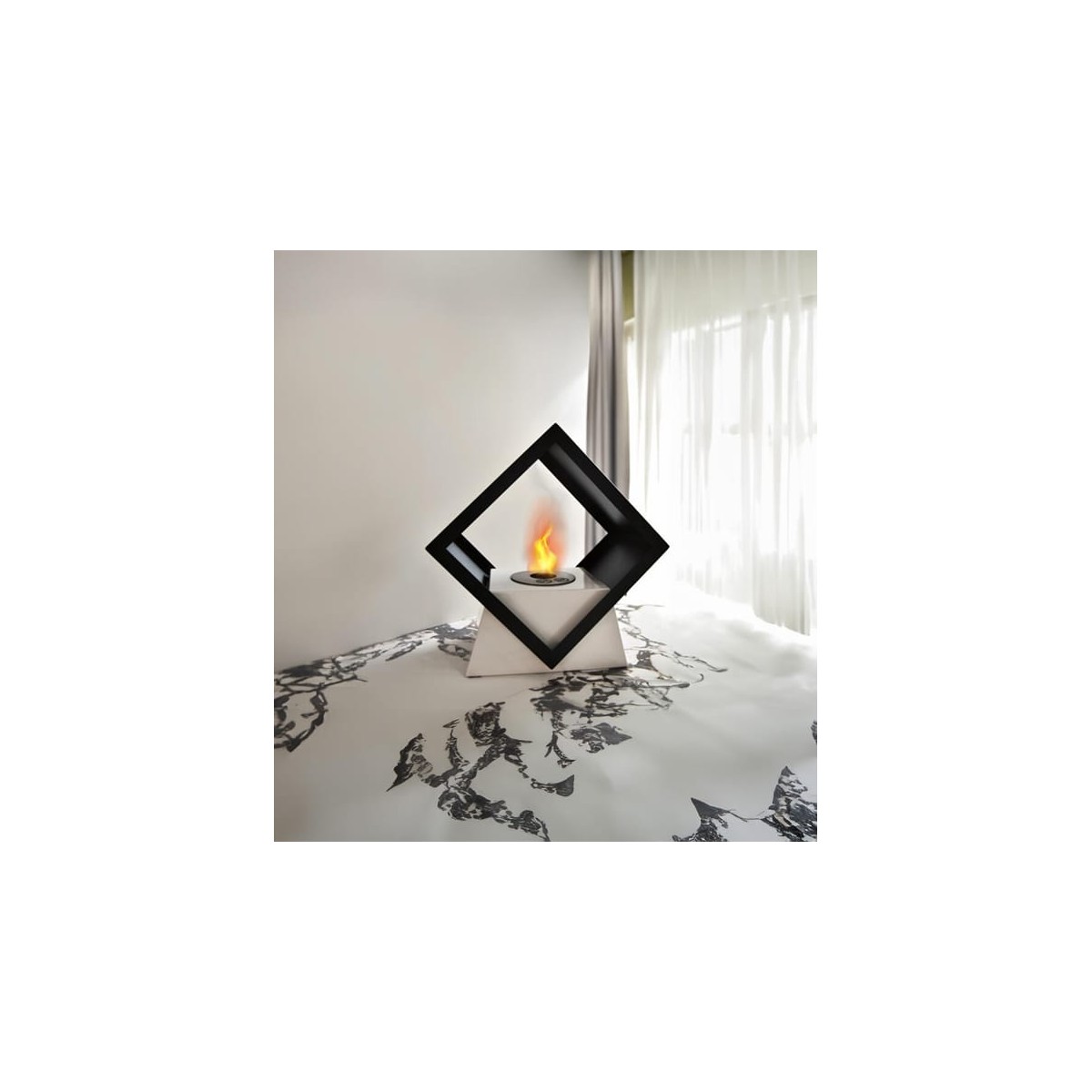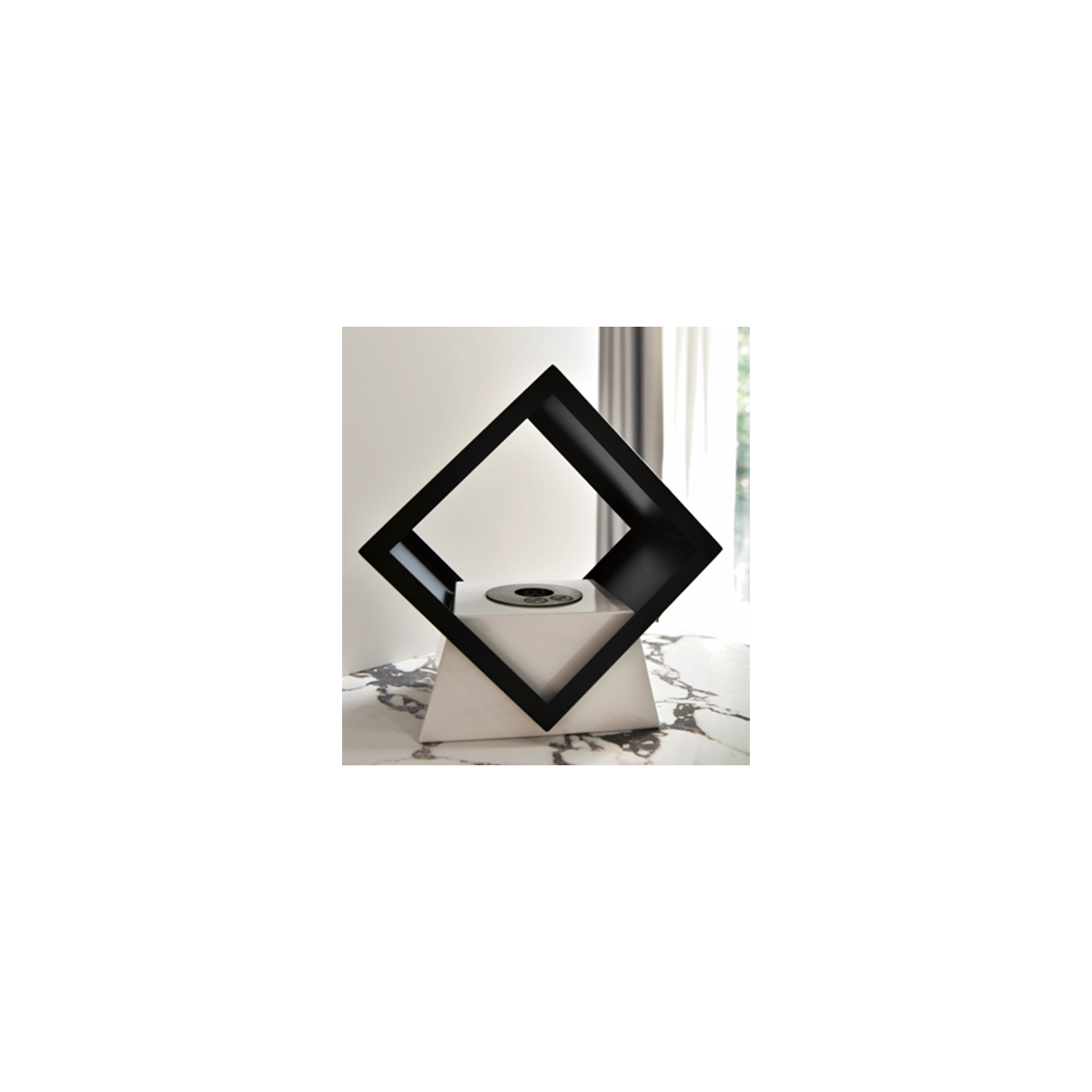 Camino a bioetanolo, nero con base bianca. Decorativo e da riscaldamento. Da appoggio su tavolo o mobile da sala. Bruciatore certificato, rotondo da 0,4 litri, posto al centro. Nuovo design. Scalda per circa 8 mq, 0,60 kw/h.
