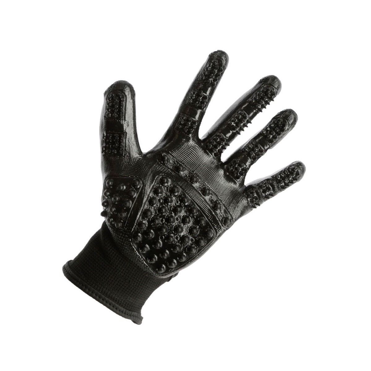Guanto con punte di varie dimensioni per massaggiare il cavallo e rimuoverne i peli. Vestibilità sicura con chiusura a strappo sul polso. In poliestere con rivestimento in gomma sintetica.