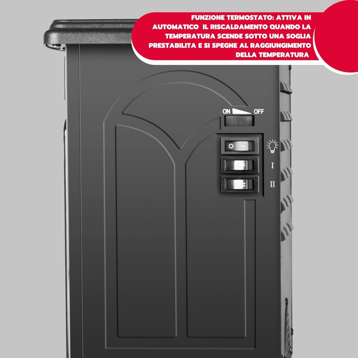 Il caminetto elettrico CAMINÒ JR, con effetto ceppo ardente, crea un’atmosfera calda e romantica. L’effetto fiamma riprodotto è indipendente dalla funzione riscaldamento, può essere quindi utilizzato anche nelle stagioni più calde. Ceramico: sicuro ed efficiente. 2 livelli di riscaldamento: eco e comfort. Riscaldamento immediato regolabile con apposito termostato. La funzione termostato attiva in automatico il riscaldamento quando la temperatura scende sotto una soglia prestabilita e lo spegne al raggiungimento di quest’ultima. Occupa poco spazio e può essere posizionato ovunque. Non sporca e non necessita di canna fumaria. Sicurezza anti surriscaldamento.