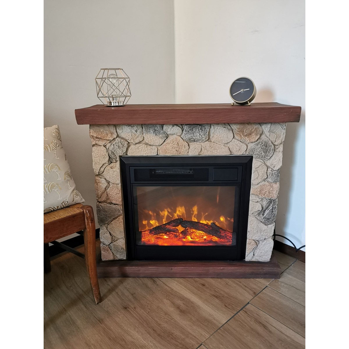 Camino elettrico rifinito con effetto pietra ed effetto legno per top e base.