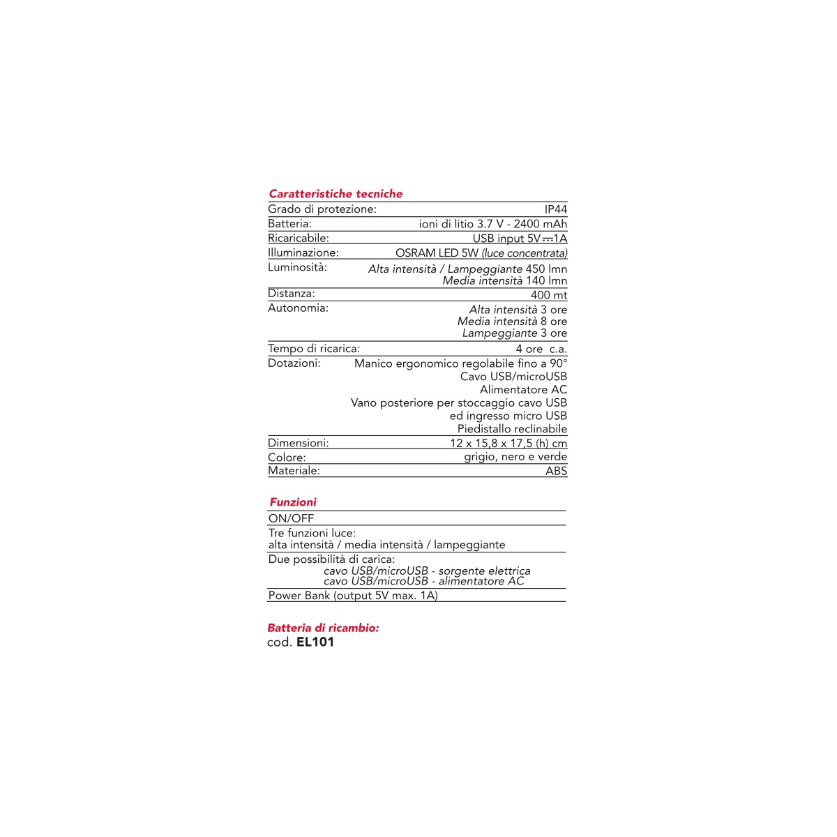 - Funzioni: media/alta intensità e lampeggiante.
