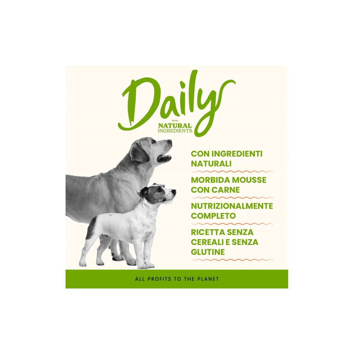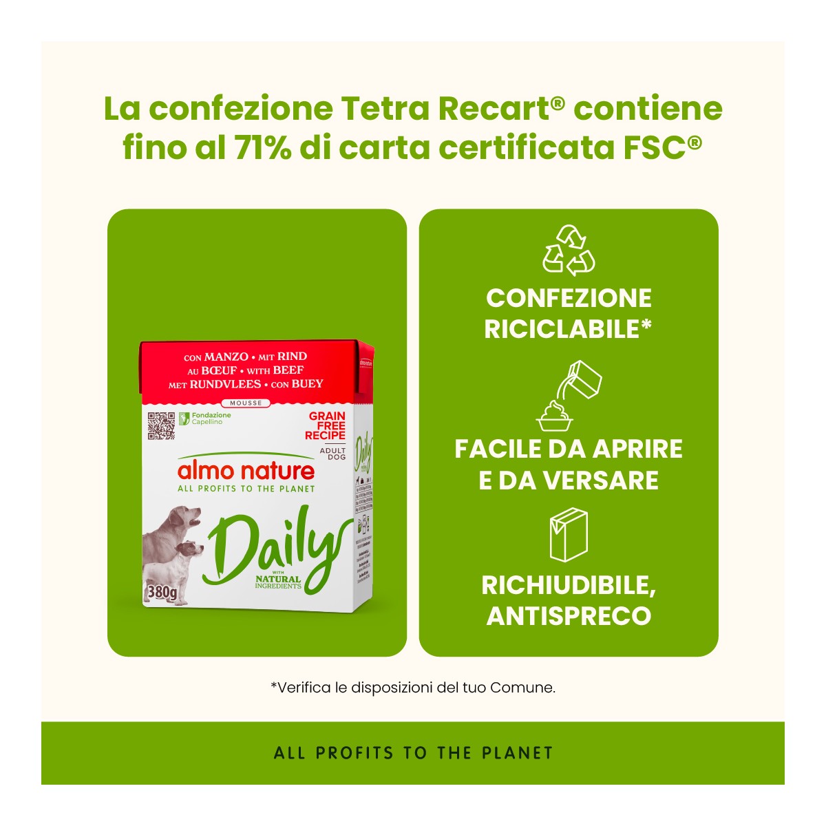 Le ricette Daily sono preparate con ingredienti naturali idonei al pet food: alimenti completi che soddisfano i gusti di tantissimi cani adulti grazie alla varietà di ingredienti(carne, pesce e rigaglie). Con le ricette Daily si ha la certezza di proporre un’alimentazione con la garanzia di qualità Almo Nature, ad un prezzo ancora più conveniente! Tutta la gamma è priva di coloranti o conservanti chimici. La confezione in Tetra Recart® è facile da aprire, comoda da versare ed ha un ridotto impatto climatico rispetto ad altre tipologie di packaging*. Contiene fino al 71% di carta certificata FSC® ed è riciclabile: se smaltita correttamente, può essere riutilizzata come materia prima per altri imballi. Daily – ricette grain free in mousse – è disponibile in confezioni richiudibili da 380 g. Almo Nature è il brand attivista 100% proprietà della Fondazione Capellino. *EuropeIFEULife Cycle Assessment (2020)
