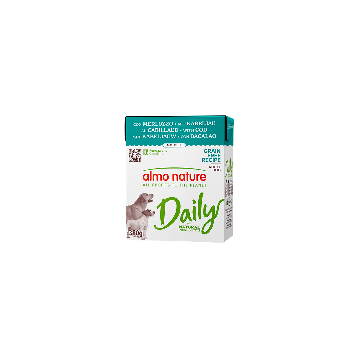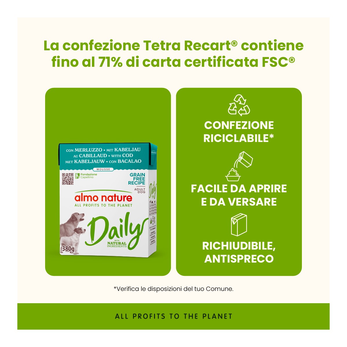 Le ricette Daily sono preparate con ingredienti naturali idonei al pet food: alimenti completi che soddisfano i gusti di tantissimi cani adulti grazie alla varietà di ingredienti(carne, pesce e rigaglie). Con le ricette Daily si ha la certezza di proporre un’alimentazione con la garanzia di qualità Almo Nature, ad un prezzo ancora più conveniente! Tutta la gamma è priva di coloranti o conservanti chimici. La confezione in Tetra Recart® è facile da aprire, comoda da versare ed ha un ridotto impatto climatico rispetto ad altre tipologie di packaging*. Contiene fino al 71% di carta certificata FSC® ed è riciclabile: se smaltita correttamente, può essere riutilizzata come materia prima per altri imballi. Daily – ricette grain free in mousse – è disponibile in confezioni richiudibili da 380 g. Almo Nature è il brand attivista 100% proprietà della Fondazione Capellino. *EuropeIFEULife Cycle Assessment (2020)