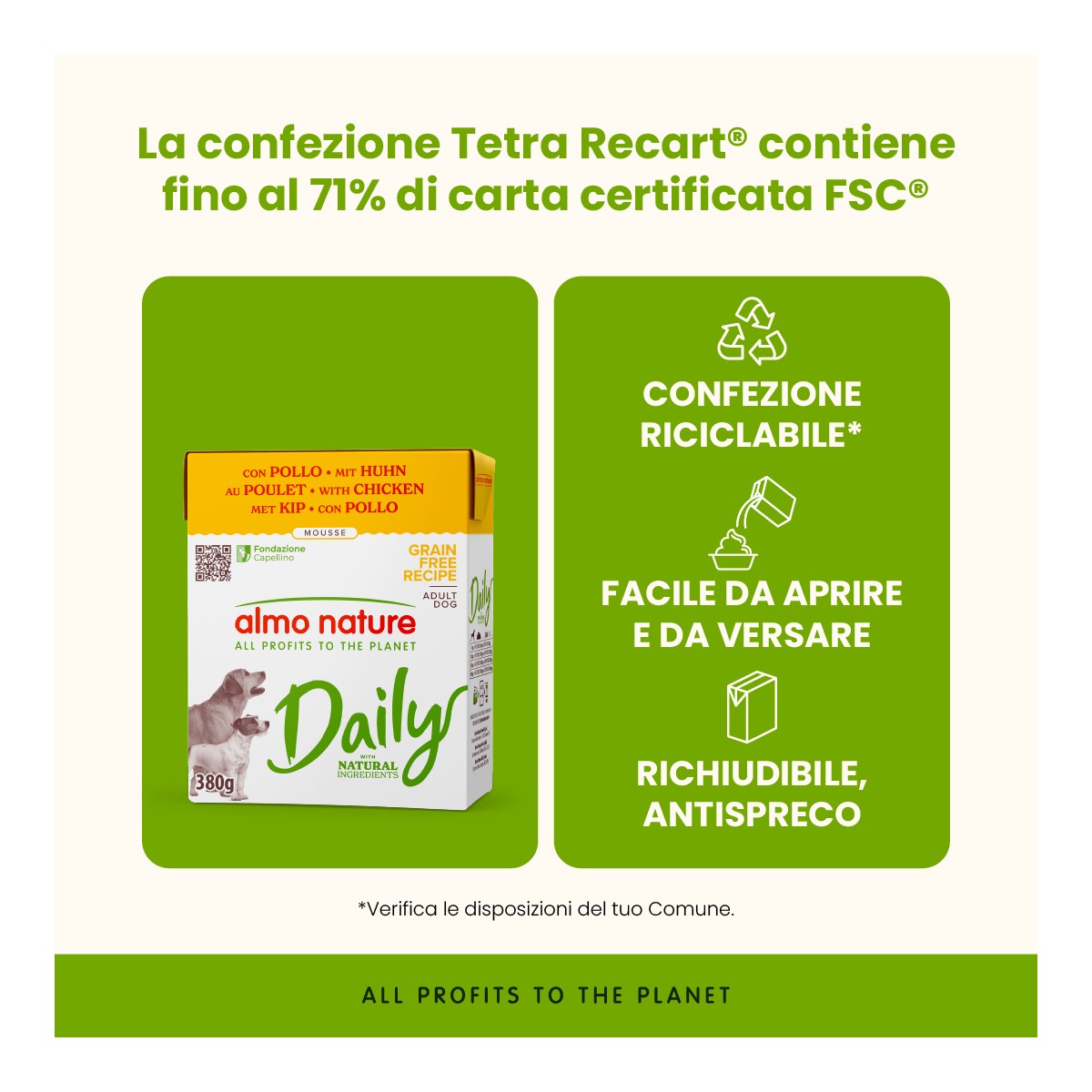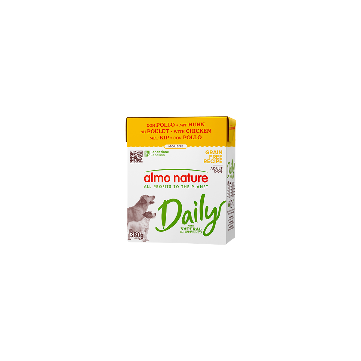 Le ricette Daily sono preparate con ingredienti naturali idonei al pet food: alimenti completi che soddisfano i gusti di tantissimi cani adulti grazie alla varietà di ingredienti(carne, pesce e rigaglie). Con le ricette Daily si ha la certezza di proporre un’alimentazione con la garanzia di qualità Almo Nature, ad un prezzo ancora più conveniente! Tutta la gamma è priva di coloranti o conservanti chimici. La confezione in Tetra Recart® è facile da aprire, comoda da versare ed ha un ridotto impatto climatico rispetto ad altre tipologie di packaging*. Contiene fino al 71% di carta certificata FSC® ed è riciclabile: se smaltita correttamente, può essere riutilizzata come materia prima per altri imballi. Daily – ricette grain free in mousse – è disponibile in confezioni richiudibili da 380 g. Almo Nature è il brand attivista 100% proprietà della Fondazione Capellino. *EuropeIFEULife Cycle Assessment (2020)