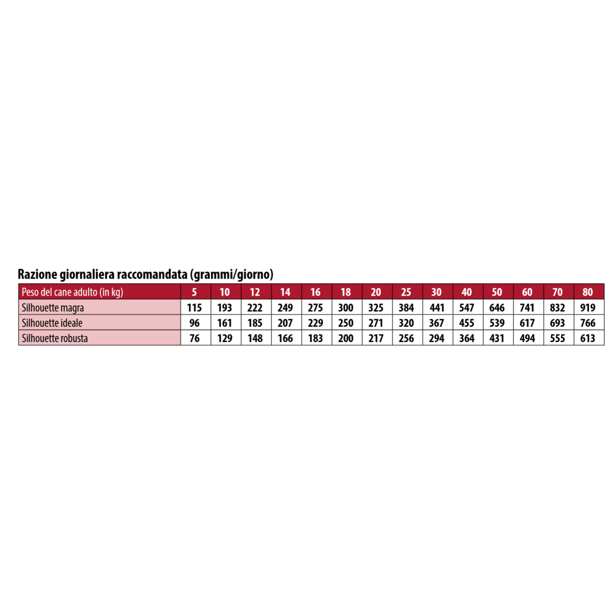 Cereali (riso 5%), carni e derivati 30% (manzo carne fresca 8%, solfato di condroitina 0,04%), oli e grassi, sottoprodotti di origine vegetale (polpa di barbabietola 2%, fruttoligosaccaridi FOS 1% e yucca schidigera 0,1%), lieviti (lieviti di birra inattivati 1%), sostanze minerali, molluschi e crostacei (glucosamina 0,057%).