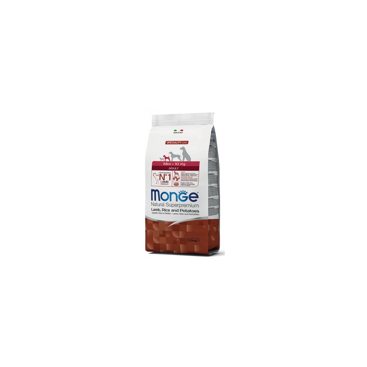 Le crocchette Monge Natural Superpremium Speciality Line Mini Adult Con Agnello, Riso e Patate sono un alimento completo per cani di piccola taglia. Garantiscono il benessere del cane grazie alla presenza di elementi nutritivi di altissima qualità, frutto della ricerca Made in Italy. È un prodotto altamente appetibile con la garanzia della monoproteina: un solo tipo di carne per ogni ricetta. Il primo ingrediente è l’agnello e sono arricchite con xilo oligossacaridi (X.O.S.), prebiotici di ultima generazione che favoriscono il benessere intestinale. Contengono estratto di carciofo, echinacea, origano e aglio che stimolano le difese immunitarie e proteggono il fegato. Le dimensioni della crocchetta sono adatte a denti e mandibole.