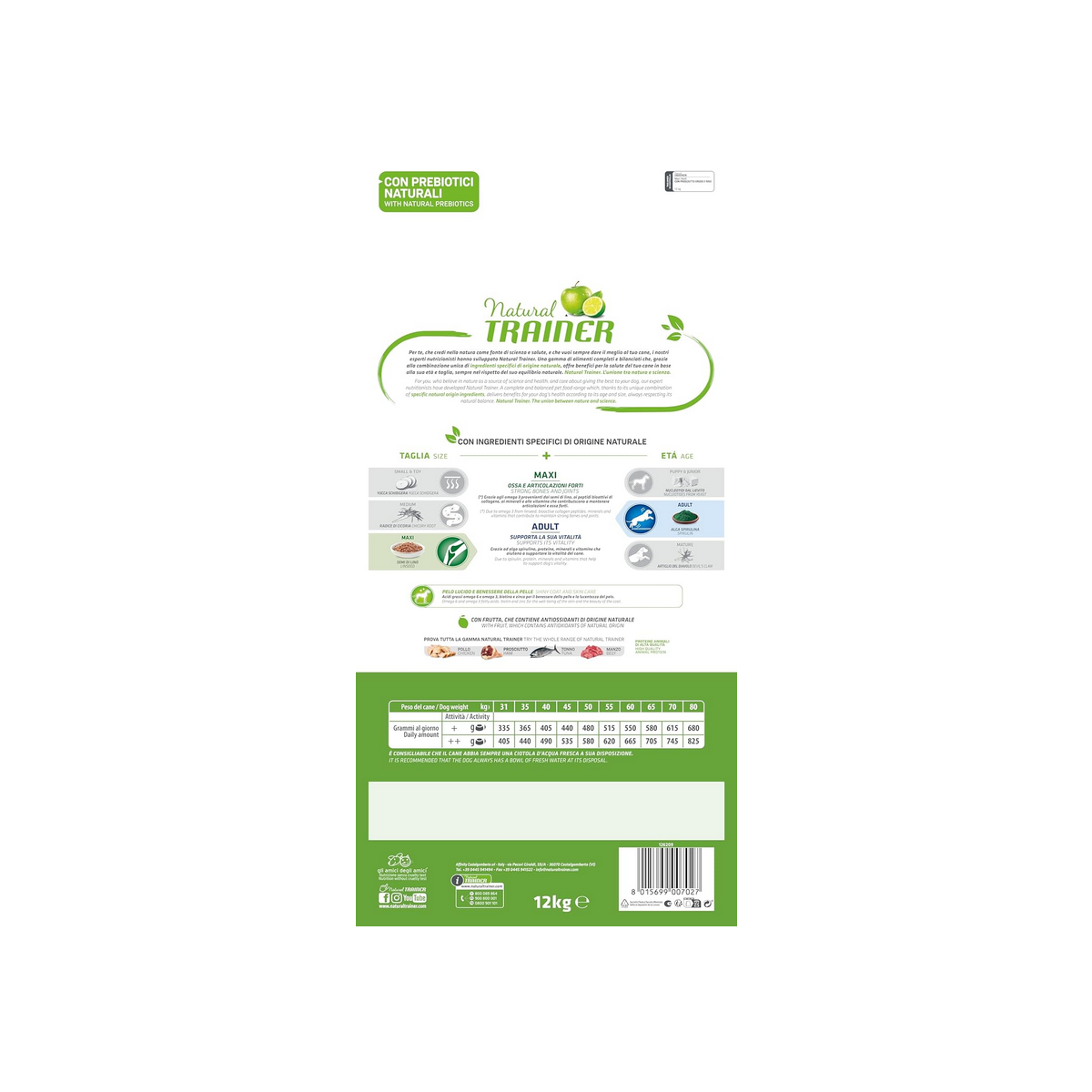 Le crocchette Natural Trainer Adult Maxi con prosciutto rappresentano un alimento completo e bilanciato con ingredienti funzionali e selezionati, in grado di favorire il benessere generale del tuo cagnolone. I nutrizionisti Trainer Natural hanno selezionato ingredienti sani e naturali che contribuiscono a mantenere la perfetta forma fisica del tuo amico a quattro zampe. I semi di lino e i peptidi bioattivi del collagene favoriscono il mantenimento della corretta funzionalità articolare. La naturale azione rivitalizzante e rigenerante dei principi nutritivi dell’Alga spirulina aiuta a supportare la vitalità dell’organismo. La specifica miscela prebiotica con estratto di Cicoria, FOS e MOS favorisce il nutrimento e il corretto sviluppo del microbiota intestinale. Carne Fresca Italiana, il mangime secco per cani adulti di taglia grande, favorisce il regolare mantenimento della muscolatura del tuo cane, conferendo appetibilità ed elevata digeribilità. Natural Trainer Adult Maxi con prosciutto caratteristiche - crocchette per cani adulti di taglia grande - alimento completo integrato con ingredienti funzionali- mantenimento della corretta funzionalità articolare- supporta la vitalità dell’organismo