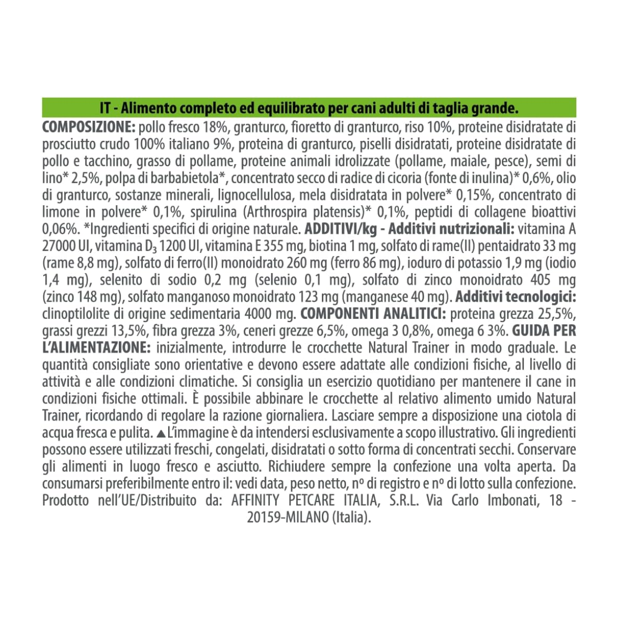 Pollo fresco , granturco , fioretto di granturco , riso 10% , proteina di granturco , proteine disidratate di prosciutto crudo 100% italiano 7% , proteine disidratate di pollo e tacchino , proteine animali idrolizzate , grasso di origine animale , semi di lino* 2,5% , polpa di barbabietola* , lievito autolisato 0,75% , olio di granturco , estratto secco di radici di cicoria (fonte di inulina)* , sostanze minerali , lignocellulosa , mela disidratata in polvere* 0,15% , concentrato di limone in polvere* 0,1% , spirulina (Arthrospira platensis)* 0,1% , peptidi di collagene bioattivi 0,06%. , *Ingredienti di origine naturale specifica. ADDITIVI NUTRIZIONALI: vitamina A 26000 UI, vitamina D3 1350 UI, vitamina E 355 mg, solfato di rame(II) pentaidrato 49,13 mg (rame: 12,5 mg), carbonato di ferro(II) 310,5 mg (ferro 150 mg), iodato di calcio anidro in granuli rivestiti 3,85 mg (iodio 2,5 mg), selenito di sodio 0,44 mg (selenio 0,2 mg), ossido di zinco 193,4 mg (zinco 156 mg), ossido di manganese (II) 45,1 mg (manganese 35 mg)., Additivi tecnologici: clinoptilolite di origine sedimentaria 4000 mg. proteina grezza 26%, grassi grezzi 14%, fibre grezze 3%, ceneri grezze 6,5%, magnesio 0,1%, Omega-3 0,75%, Omega-6 3%.
