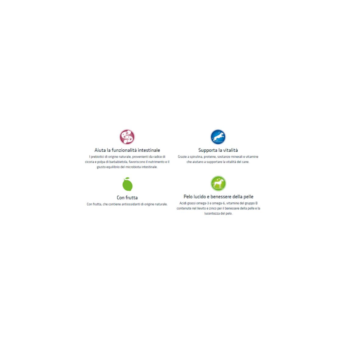 Pollo fresco , granturco , proteine disidratate di pollo e tacchino , fioretto di granturco , riso 10% , proteine disidratate di prosciutto crudo 100% italiano 4,5% , grasso di origine animale , proteina di granturco , proteine animali idrolizzate , semi di lino* , polpa di barbabietola* 2% , lievito autolisato 0,75% , estratto secco di radici di cicoria (fonte di inulina)* 0,7% , olio di granturco , sostanze minerali , lignocellulosa , mela disidratata in polvere* 0,15%, , concentrato di limone in polvere* 0,1% , spirulina (Arthrospira platensis)* 0,1%. , *Ingredienti di origine naturale specifica. ADDITIVI NUTRIZIONALI: vitamina A 26000 UI, vitamina D3 1350 UI, vitamina E 355 mg, solfato di rame(II) pentaidrato 49,13 mg (rame: 12,5 mg), carbonato di ferro(II) 310,5 mg (ferro 150 mg), iodato di calcio anidro in granuli rivestiti 3,85 mg (iodio 2,5 mg), selenito di sodio 0,44 mg (selenio 0,2 mg), ossido di zinco 193,4 mg (zinco 156 mg), ossido di manganese (II) 45,1 mg (manganese 35 mg)., Additivi tecnologici: clinoptilolite di origine sedimentaria 4000 mg. proteina grezza 26%, grassi grezzi 16%, fibre grezze 2,5%, ceneri grezze 6,5%, Omega-3 0,8%, Omega-6 3%.