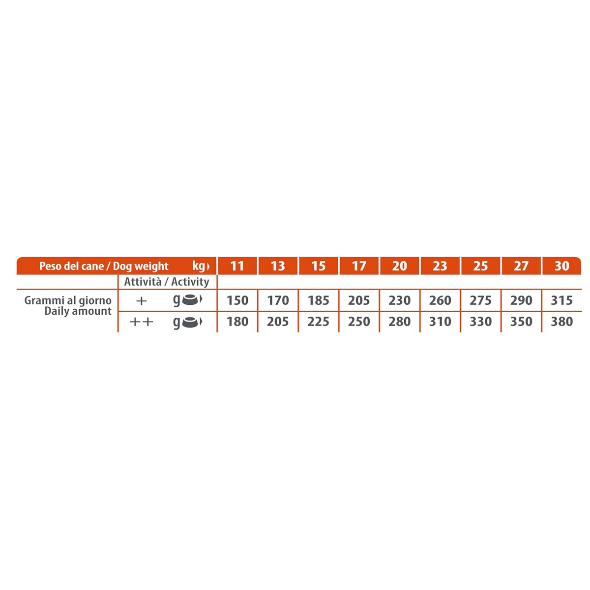 la prima volta introduci l'alimento gradualmente. Servilo tal quale oppure leggermente inumidito con acqua tiepida. Adatta il numero di pasti e le quantità giornaliere consigliate nella tabella allegata in base alle sue esigenze. Puoi abbinare le crocchette all’alimento umido corrispondente, ricordandoti di aggiustare la razione giornaliera. Lasciagli sempre a disposizione una ciotola di acqua fresca e pulita. Conserva l'alimento in un luogo fresco e asciutto. Chiudi sempre la confezione dopo l’apertura. *L’immagine è solo a scopo illustrativo. Gli ingredienti possono essere utilizzati freschi, disidratati o sotto forma di estratti secchi.