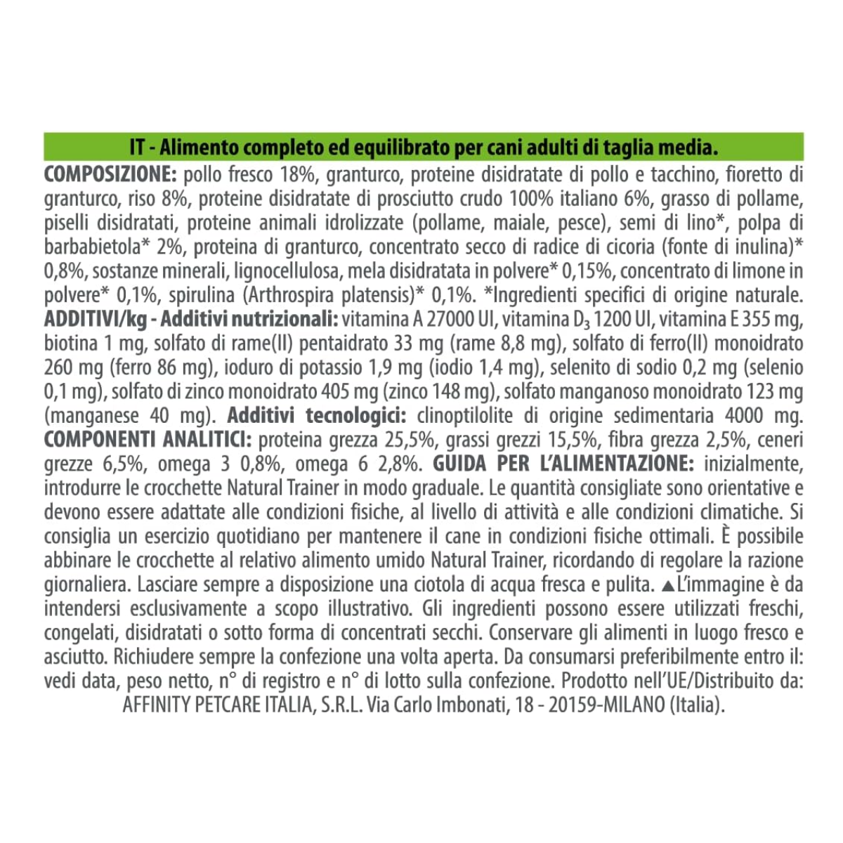 Natural Trainer Adult Medium Prosciutto Crudo e Riso contengono esclusivi e genuini ingredienti funzionali perfetti per garantire il benessere generale del tuo fedele amico. Le naturali proprietà dell’estratto di Yucca contribuiscono a ridurre l’odore delle feci, aiutando a limitare le fermentazioni proteiche intestinali. La naturale azione rivitalizzante e rigenerante dei principi nutritivi dell’Alga spirulina aiuta a supportare la vitalità dell’organismo. La forma speciale di Vitamina C aiuta a prevenire la formazione di tartaro e alito cattivo. Il mangime secco Trainer Natural con Carne Fresca Italiana favorisce il regolare mantenimento della muscolatura del tuo cane, conferendo appetibilità ed elevata digeribilità grazie al valore nutrizionale della carne fresca di pollo e tacchino 100% italiana, disossata e non congelata. Natural Trainer Adult Medium Prosciutto Crudo e Riso caratteristiche: - cibo secco per cani adulti di taglia media - con ingredienti di ottima qualità - con carne fresca italiana - alimento completo - azione rivitalizzante e rigenerante