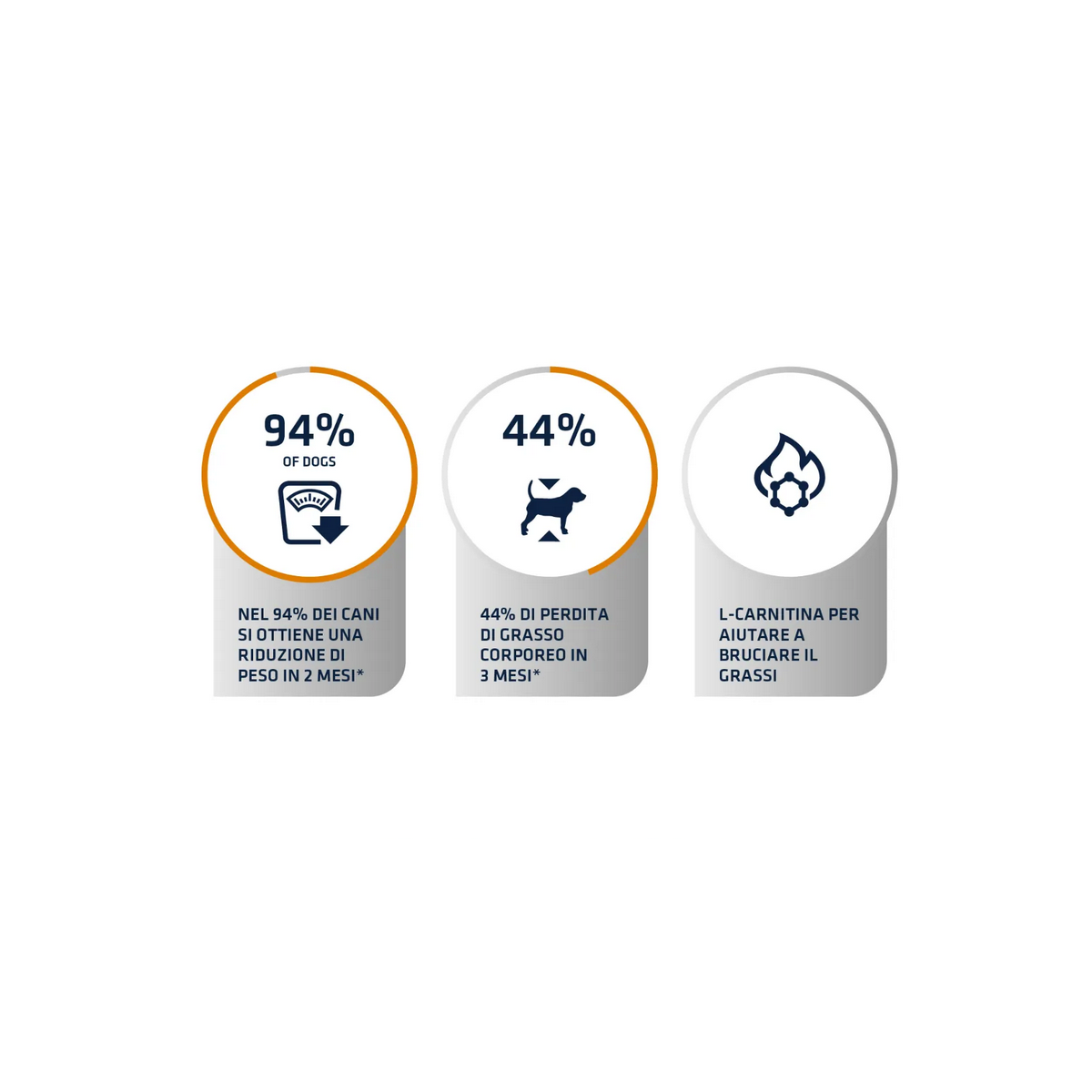 NEL 94% DEI CANI SI OTTIENE UNA RIDUZIONE DI PESO IN 2 MESI 44% DI PERDITA DI GRASSO CORPOREO IN 3 MESI L-CARNITINA PER AIUTARE A BRUCIARE IL GRASSO.