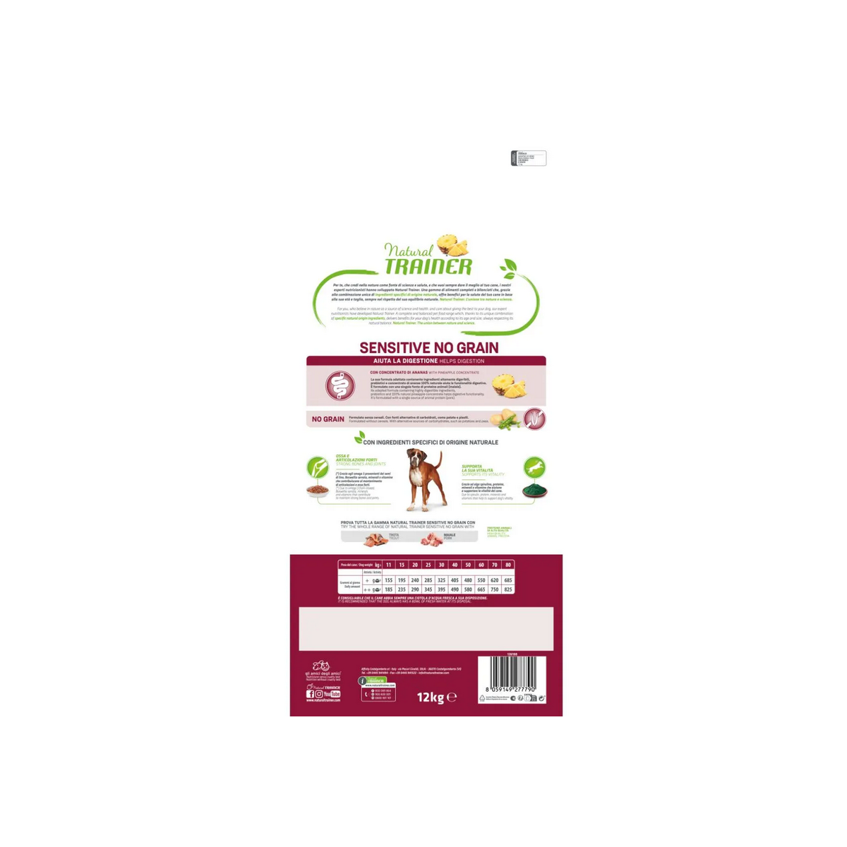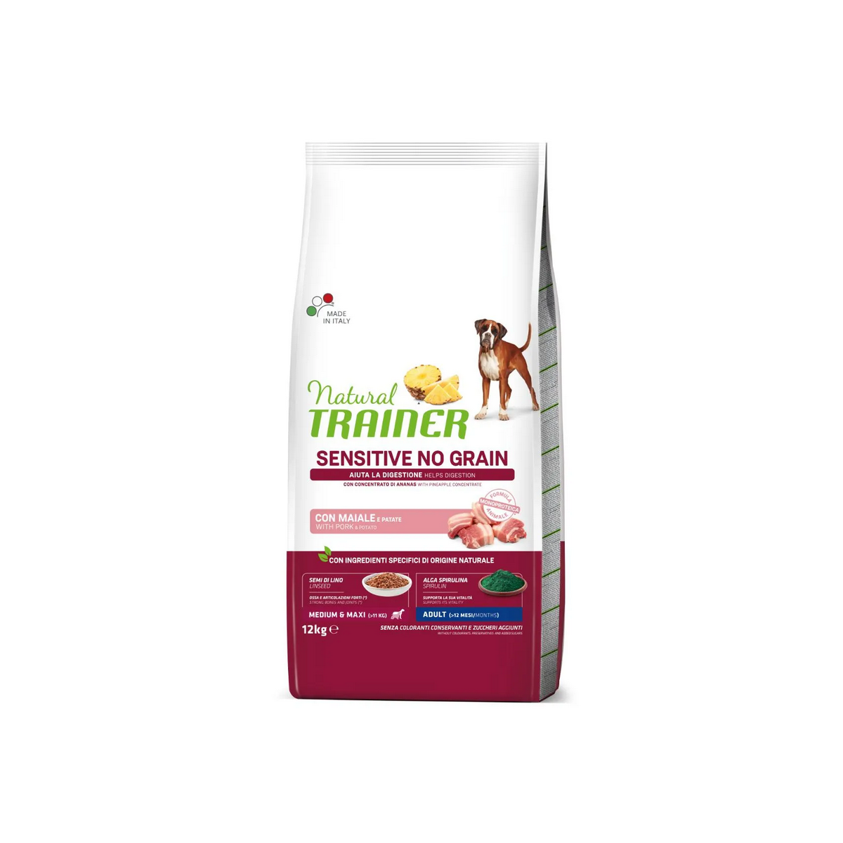 Natural Trainer Sensitive No Grain Medium Maxi Maiale è un alimento secco completo ed equilibrato appositamente formulato per cani adulti di taglia media e grande con particolare sensibilità digestiva. Preparate con cura e dedizione, queste crocchette sono un concentrato di ingredienti naturali, studiati per favorire la funzionalità digestiva e promuovere il benessere generale del tuo cane. Questo alimento senza coloranti, conservanti e zuccheri aggiunti, senza cereali nella sua composizione, la formula si avvale di fonti alternative di carboidrati, come patate e piselli, per fornire energia al tuo cane in modo equilibrato e sostenibile. La formula di questo mangime contiene ingredienti altamente digeribili e la carne di maiale come sola fonte di proteina animale di alta qualità, inoltre l’estratto di ananas 100% naturale presente nella composizione di questo alimento, aggiunge un tocco di freschezza e contribuisce ad un processo digestivo più efficiente, garantendo che il tuo cane possa godere appieno di ogni pasto. I cereali integrali forniscono fibre essenziali che supportano la salute intestinale, i prebiotici stimolano la crescita di batteri benefici nell'intestino, mentre gli acidi grassi Omega 3 provenienti dai semi di lino supportano la salute della pelle e del pelo, contribuendo a mantenere il manto del tuo cane lucido e sano. Inoltre, la presenza di Boswellia serrata aiuta a prendersi cura delle articolazioni, fornendo al tuo cane il supporto necessario per mantenere una mobilità agevole e confortevole nel corso degli anni. Infine, l'alga spirulina, le proteine, i minerali e le vitamine contenute in queste crocchette aiutano a supportare la vitalità generale del tuo cane, assicurandoti di avere un compagno pieno di energia e vitalità.