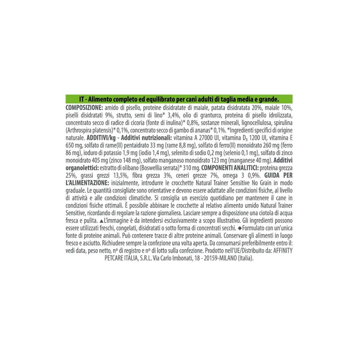 Componenti Analitici: proteina grezza 25%, grassi grezzi 13,5%, fibra grezza 3%, ceneri grezze 7%, omega 3 0,9%.