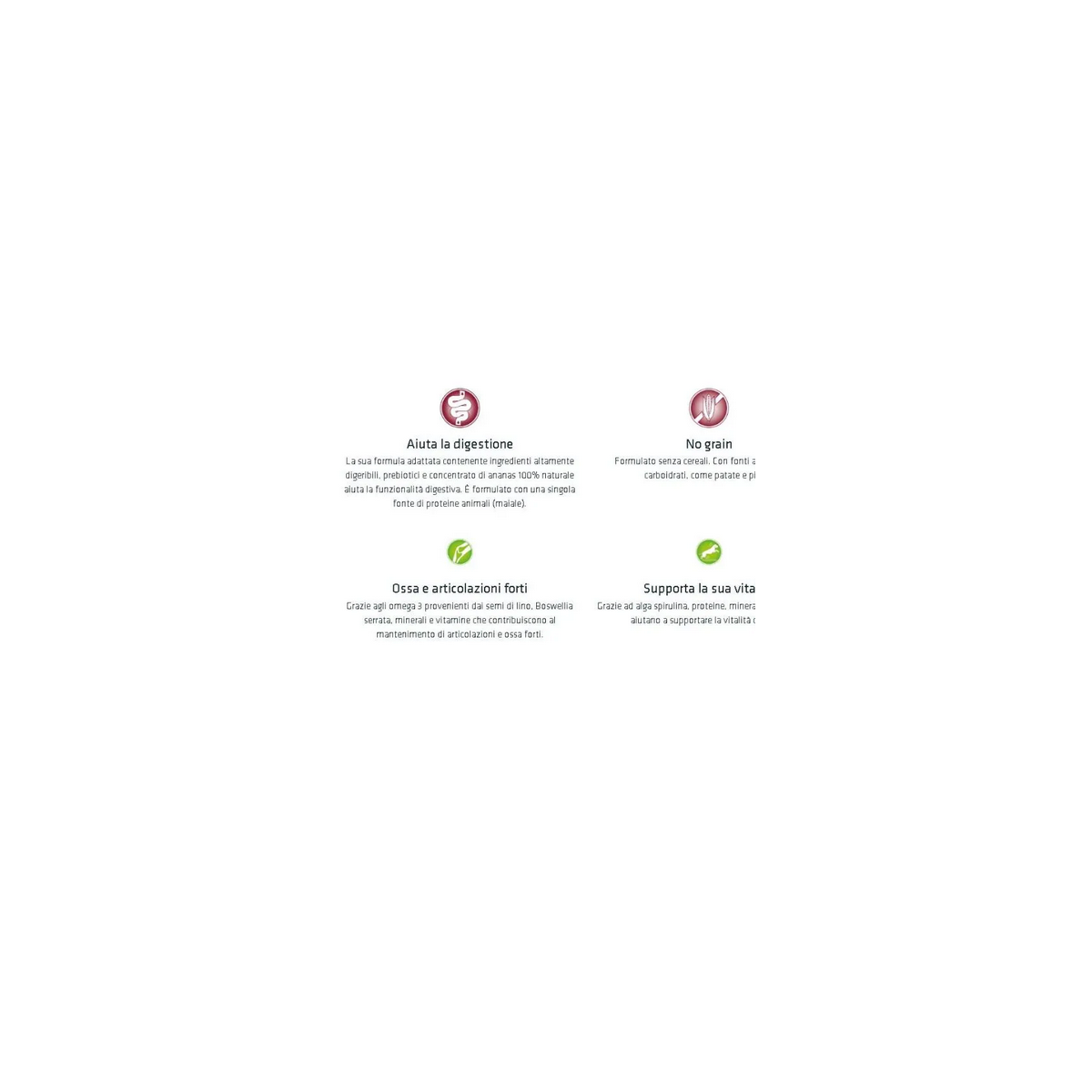 Composizione: amido di pisello, proteine disidratate di maiale, patata disidratata 20%, maiale 10%, piselli disidratati 9%, strutto, semi di lino* 3,4%, olio di granturco, proteina di pisello idrolizzata, concentrato secco di radice di cicoria (fonte di inulina)* 0,8%, sostanze minerali, lignocellulosa, spirulina (Arthrospira platensis)* 0,1%, concentrato secco di gambo di ananas* 0,1%. *Ingredienti specifici di origine naturale.