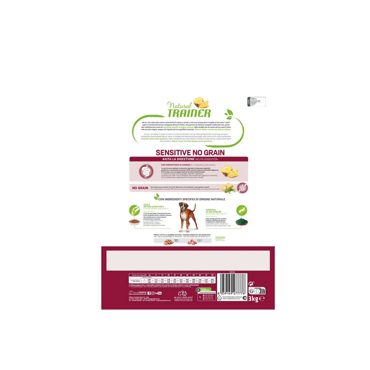 Scegli Natural Trainer Sensitive No Grain Medium Maxi per fornire al tuo cane una dieta sana e adatta alle sue esigenze specifiche, perché un cane felice è un cane sano.