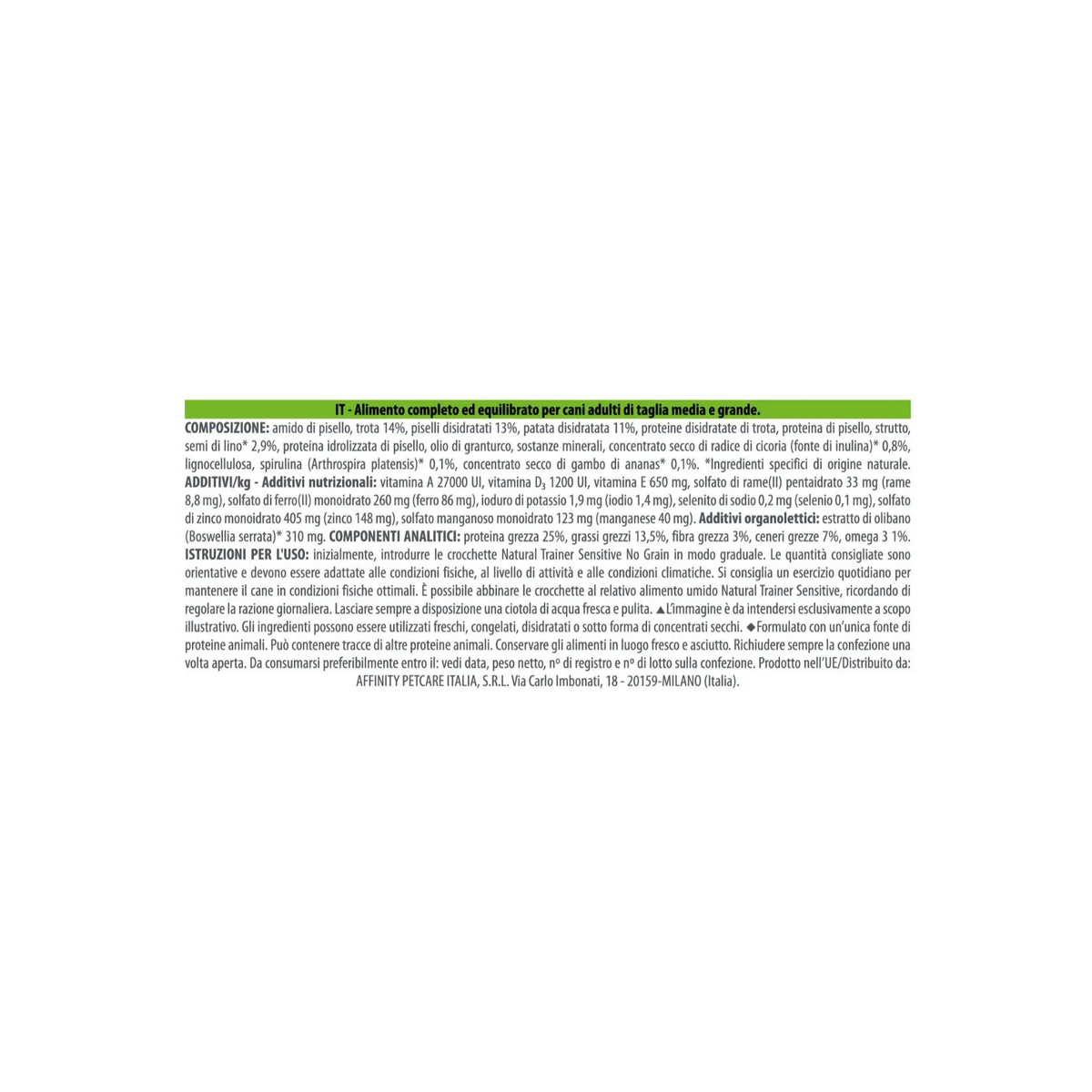 Natural Trainer Sensitive No Grain Medium Maxi Trota è un alimento secco completo ed equilibrato appositamente formulato per cani adulti di taglia media e grande con particolare sensibilità digestiva. Preparate con cura e dedizione, queste crocchette sono un concentrato di ingredienti naturali, studiati per favorire la funzionalità digestiva e promuovere il benessere generale del tuo cane. Questo alimento senza coloranti, conservanti e zuccheri aggiunti, senza cereali nella sua composizione, la formula si avvale di fonti alternative di carboidrati, come patate e piselli, per fornire energia al tuo cane in modo equilibrato e sostenibile. La formula di questo mangime contiene ingredienti altamente digeribili e la trota come sola fonte di proteina animale di alta qualità, inoltre l’estratto di ananas 100% naturale presente nella composizione di questo alimento, aggiunge un tocco di freschezza e contribuisce ad un processo digestivo più efficiente, garantendo che il tuo cane possa godere appieno di ogni pasto. I cereali integrali forniscono fibre essenziali che supportano la salute intestinale, i prebiotici stimolano la crescita di batteri benefici nell'intestino, mentre gli acidi grassi Omega 3 provenienti dai semi di lino supportano la salute della pelle e del pelo, contribuendo a mantenere il manto del tuo cane lucido e sano. Inoltre, la presenza di Boswellia serrata aiuta a prendersi cura delle articolazioni, fornendo al tuo cane il supporto necessario per mantenere una mobilità agevole e confortevole nel corso degli anni. Infine, l'alga spirulina, le proteine, i minerali e le vitamine contenute in queste crocchette aiutano a supportare la vitalità generale del tuo cane, assicurandoti di avere un compagno pieno di energia e vitalità.