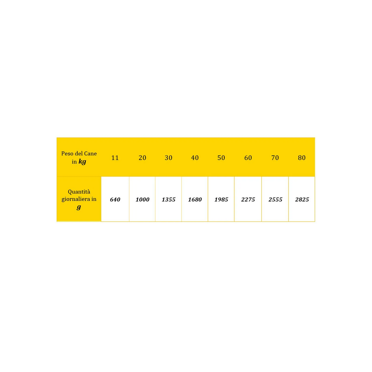 vedere la tabella per le razioni giornaliere raccomandate. Queste quantità rappresentano solo delle linee guida. Per aiutare a mantenere il tuo cane nella condizione corporea ideale, adattare le quantità di cibo giornaliere a seconda del livello di attività, condizione fisica e dei bisogni individuali del tuo amico a quattro zampe. Lasciare sempre a disposizione acqua pulita e fresca. Per tenere sotto controllo la salute del tuo cane consultare regolarmente un veterinario.