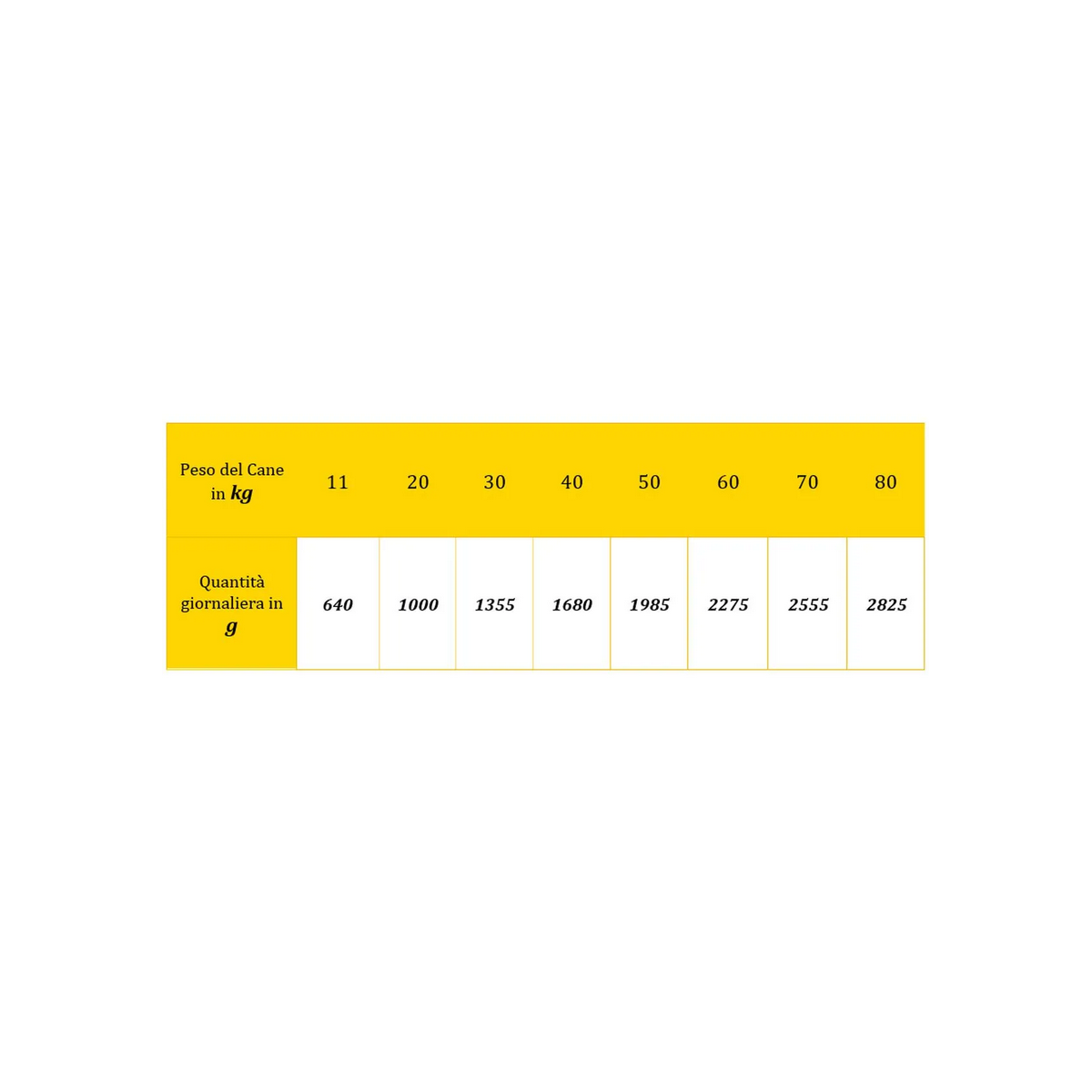 vedere la tabella per le razioni giornaliere raccomandate. Queste quantità rappresentano solo delle linee guida. Per aiutare a mantenere il tuo cane nella condizione corporea ideale, adattare le quantità di cibo giornaliere a seconda del livello di attività, condizione fisica e dei bisogni individuali del tuo amico a quattro zampe. Lasciare sempre a disposizione acqua pulita e fresca. Per tenere sotto controllo la salute del tuo cane consultare regolarmente un veterinario.
