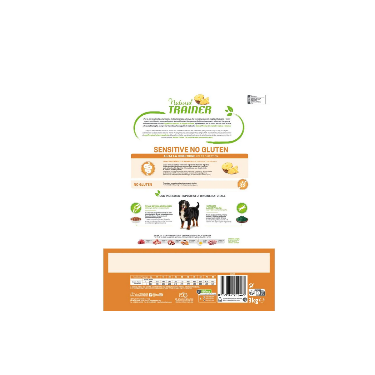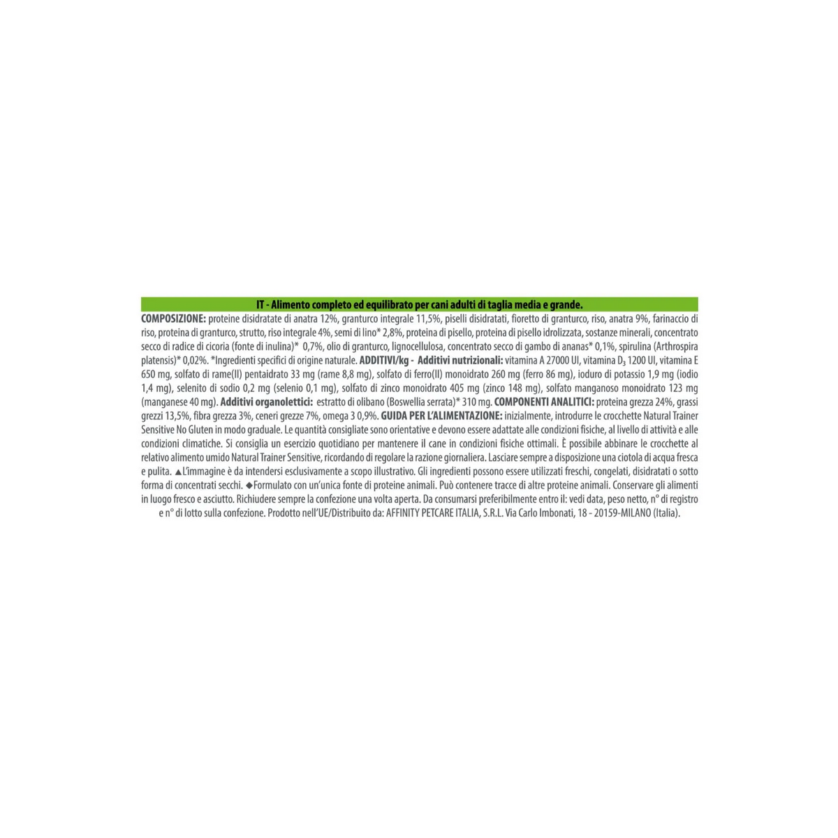 Natural Trainer Sensitive No Gluten Adult Medium Maxi Anatra è un alimento secco completo ed equilibrato appositamente formulato per cani adulti di taglia media e grande con particolare sensibilità digestiva. Preparate con cura e dedizione, queste crocchette sono un concentrato di ingredienti naturali, studiati per favorire la funzionalità digestiva e promuovere il benessere generale del tuo cane. Questo alimento senza glutine e senza coloranti, conservanti e zuccheri aggiunti e con ingredienti altamente digeribili contiene la carne di anatra come sola fonte di proteina animale di alta qualità, inoltre l’estratto di ananas 100% naturale presente nella composizione di questo alimento, aggiunge un tocco di freschezza e contribuisce ad un processo digestivo più efficiente, garantendo che il tuo cane possa godere appieno di ogni pasto. I cereali integrali forniscono fibre essenziali che supportano la salute intestinale, i prebiotici stimolano la crescita di batteri benefici nell'intestino, mentre gli acidi grassi Omega 3 provenienti dai semi di lino supportano la salute della pelle e del pelo, contribuendo a mantenere il manto del tuo cane lucido e sano. Inoltre, la presenza di Boswellia serrata aiuta a prendersi cura delle articolazioni, fornendo al tuo cane il supporto necessario per mantenere una mobilità agevole e confortevole nel corso degli anni. Infine, l'alga spirulina, le proteine, i minerali e le vitamine contenute in queste crocchette aiutano a supportare la vitalità generale del tuo cane, assicurandoti di avere un compagno pieno di energia e vitalità.