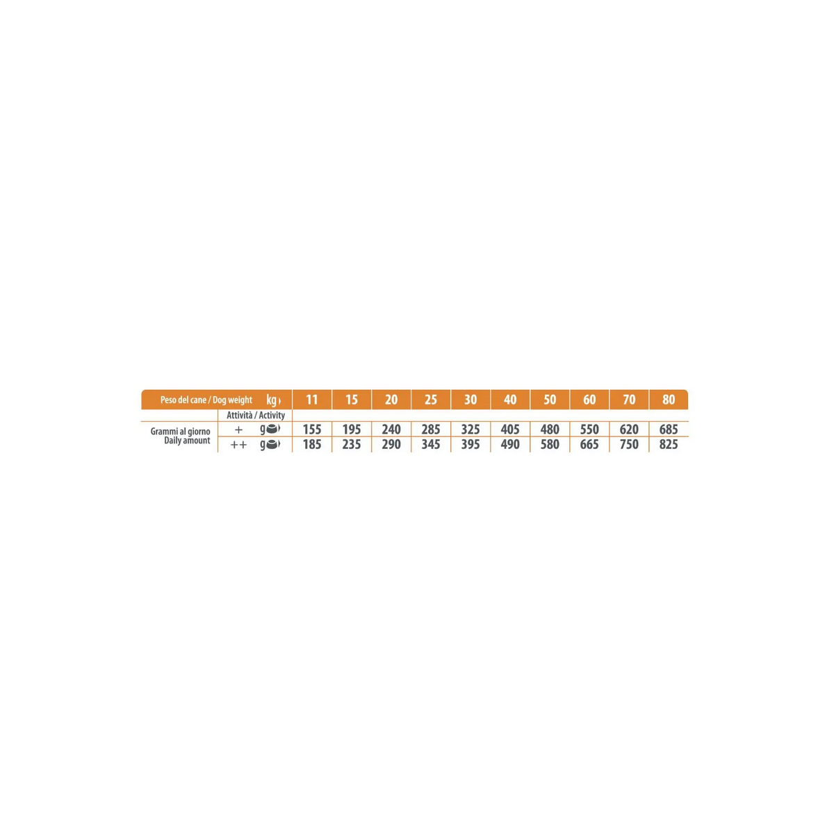 Componenti Analitici: proteina grezza 24%, grassi grezzi 13,5%, fibra grezza 3%, ceneri grezze 7%, omega 3 0,9%.