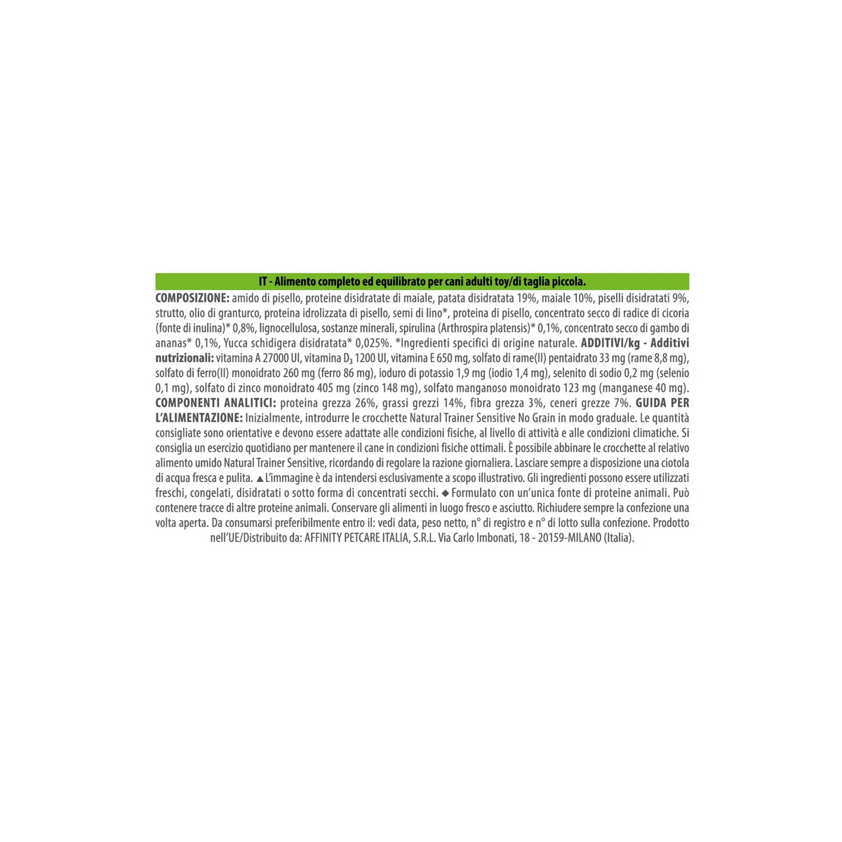 Componenti analitici: proteina grezza 26%, grassi grezzi 14%, fibra grezza 3%, ceneri grezze 7%