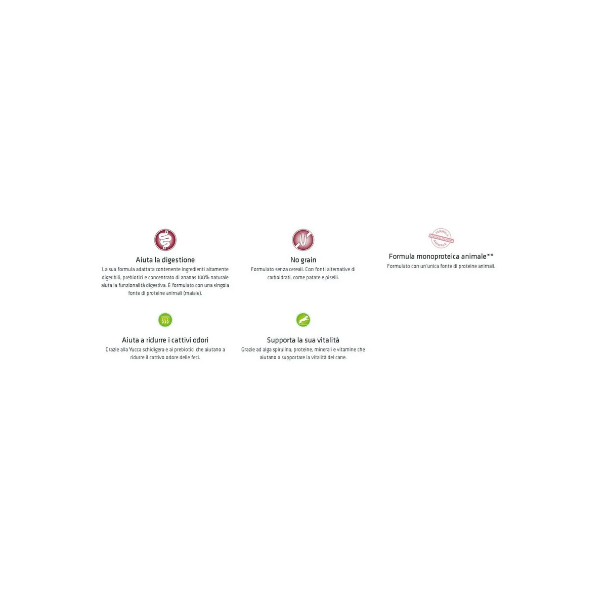 Formulato con una singola fonte di proteine animali in questo caso il maiale, inoltre è formulato senza ingredienti contenenti glutine, infatti la fonte di carboidrati è data dal riso.