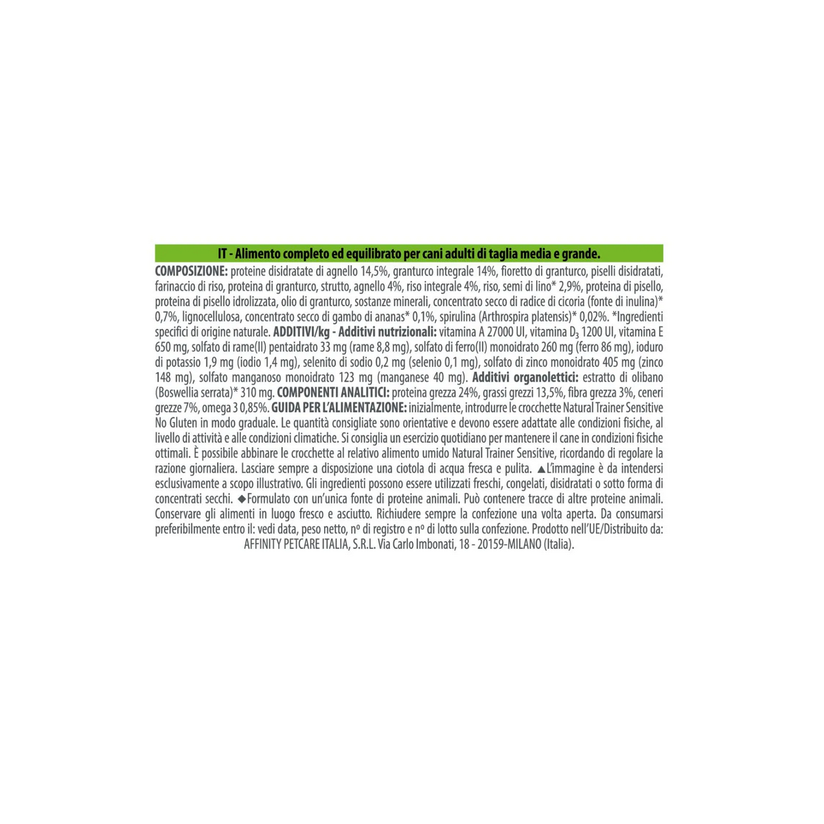 Natural Trainer Sensitive No Gluten Adult Medium Maxi Agnello è un alimento secco completo ed equilibrato appositamente formulato per cani adulti di taglia media e grande con particolare sensibilità digestiva. Preparate con cura e dedizione, queste crocchette sono un concentrato di ingredienti naturali, studiati per favorire la funzionalità digestiva e promuovere il benessere generale del tuo cane. Questo alimento senza glutine e senza coloranti, conservanti e zuccheri aggiunti e con ingredienti altamente digeribili contiene la carne di agnello come sola fonte di proteina animale di alta qualità, inoltre l’estratto di ananas 100% naturale presente nella composizione di questo alimento, aggiunge un tocco di freschezza e contribuisce ad un processo digestivo più efficiente, garantendo che il tuo cane possa godere appieno di ogni pasto. I cereali integrali forniscono fibre essenziali che supportano la salute intestinale, i prebiotici stimolano la crescita di batteri benefici nell'intestino, mentre gli acidi grassi Omega 3 provenienti dai semi di lino supportano la salute della pelle e del pelo, contribuendo a mantenere il manto del tuo cane lucido e sano. Inoltre, la presenza di Boswellia serrata aiuta a prendersi cura delle articolazioni, fornendo al tuo cane il supporto necessario per mantenere una mobilità agevole e confortevole nel corso degli anni. Infine, l'alga spirulina, le proteine, i minerali e le vitamine contenute in queste crocchette aiutano a supportare la vitalità generale del tuo cane, assicurandoti di avere un compagno pieno di energia e vitalità.